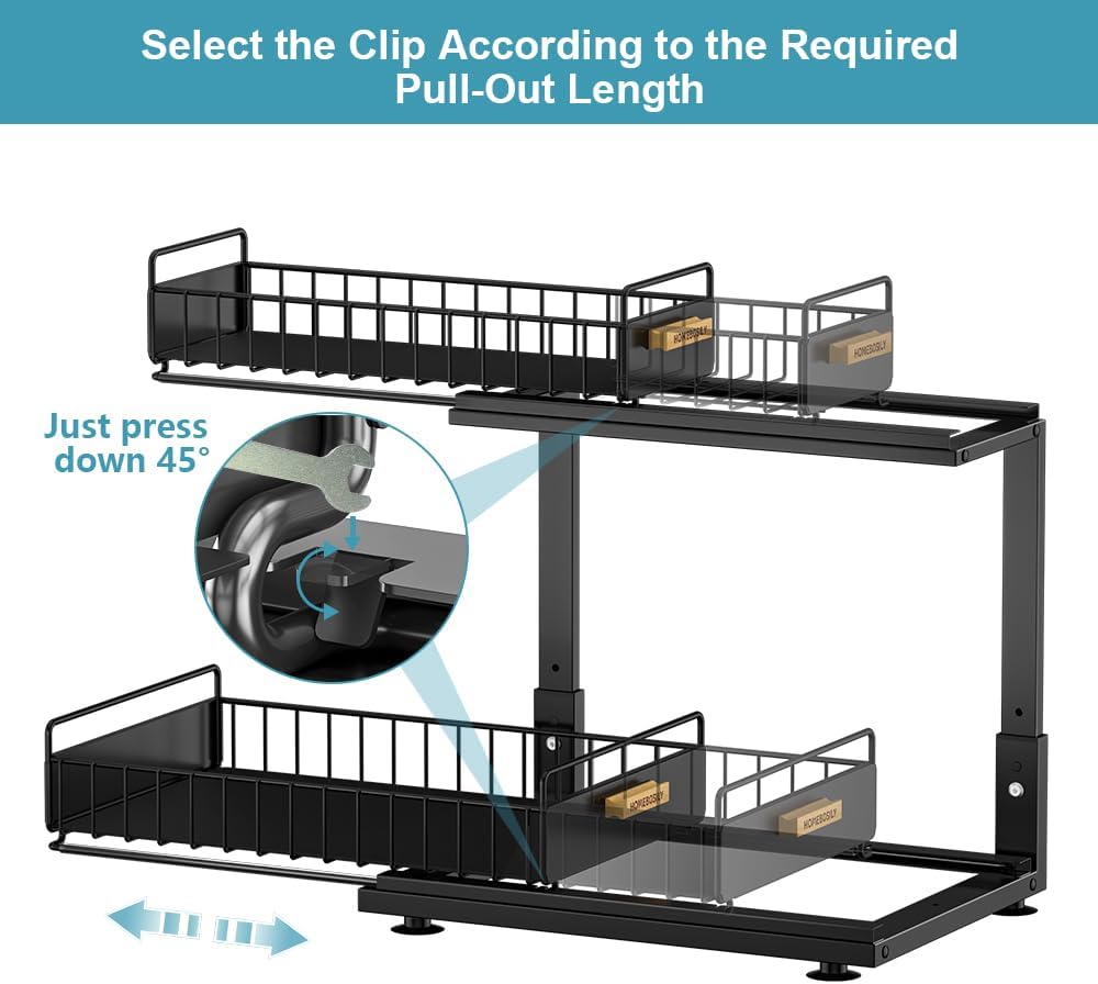 - Sturdy and Clean: Kitchen organizers and storage is made of high-quality metal, and powder coating process ensures that under sink organizers and storage is more stable. The hollow grid structure prevents residual water accumulation, the components are detachable and can be cleaned with water