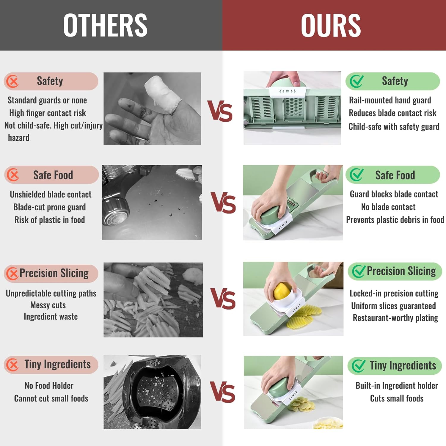 - Safe & Smart Hand Guard‌ – Our sliding-track hand guard wraps securely around the slicer body, keeping veggies in place for straight, even cuts. Unlike loose guards that may shift and touch blades (risking plastic scraps in your food), this semi-fixed design stays safely anchored while slicing. Easily detach it when not needed