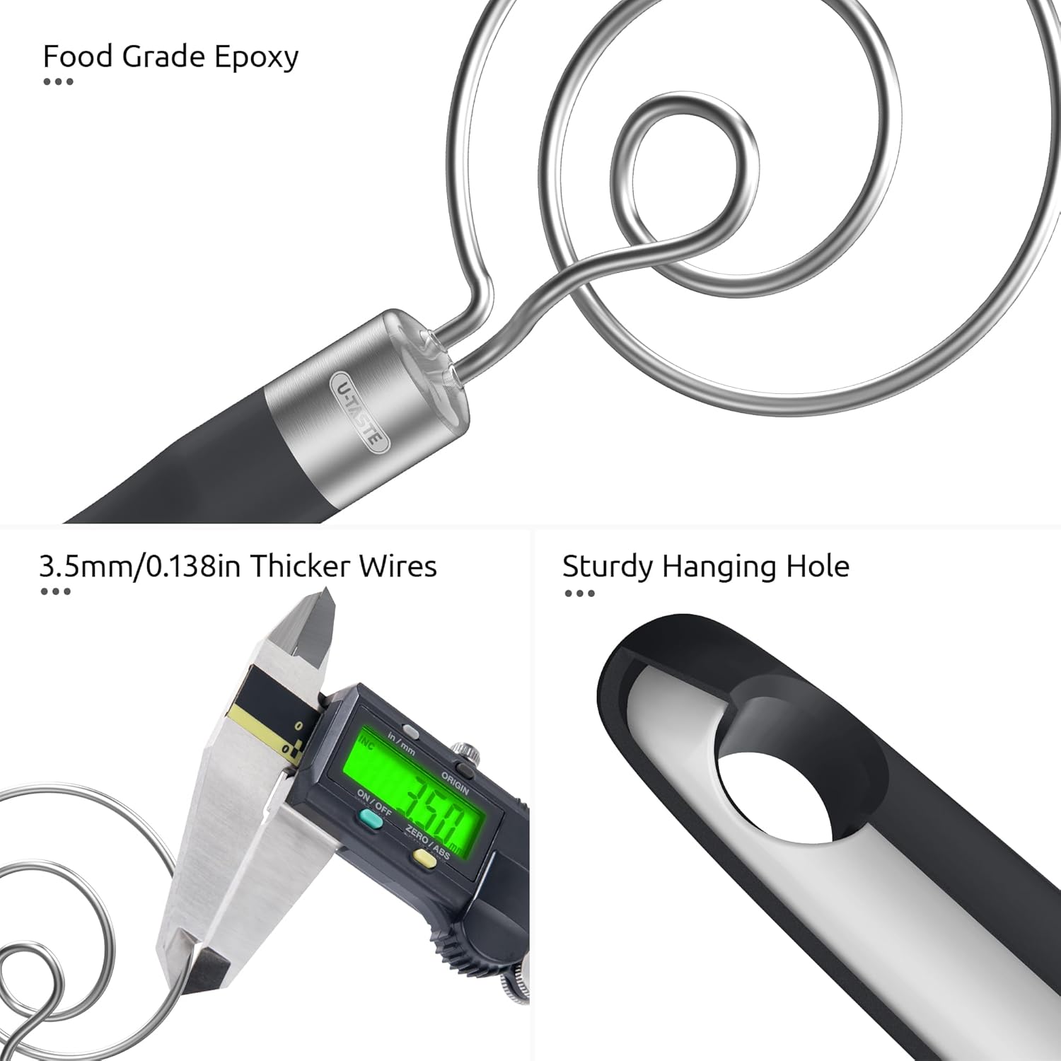 - [Heavy Duty Ergonomic 8.6in Long Handle] Are you still worried about your blender's mixing head falling off wooden handle? Compared to others’ wood handle, U-Taste’ sourdough whisk chooses silicone handle, which bonds more firmly to the stainless steel, offers comfortable, non-slip grip, allows long-lasting and heat-resistant use. No more breaking, falling off or food safe issues. 8.6in long keeps your hands clean from sticky dough. 0.95in wide allows mix heavy doughs without hand fatigue.
