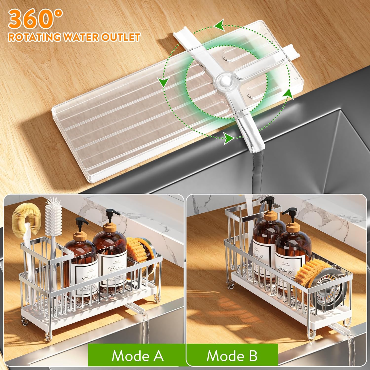 - 【STABLE DRAIN TRAY & AUTOMATIC DRAINAGE】The drain tray is fixed to the frame, so it won't come loose and drop when is use. Sloped design ensures fast drainage. This sink caddy is great for holding all the cleaning things and keeping water off the counter.