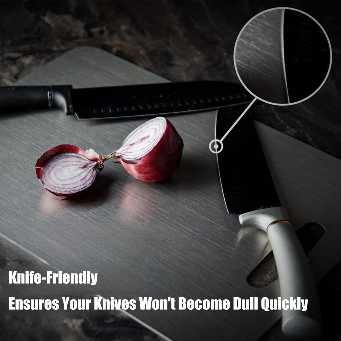 - ă100% pure titanium cutting boardăPure titanium cutting board completely improves the shortcomings of traditional cutting boards: traditional cutting boards are prone to cutting gaps, leaving food residues at the gaps,and absorbing odors and other minor problems. The front side is for cutting fruits and vegetables, and the back side is for cutting meat to avoid cross-use, and make our food processing safer and healthier