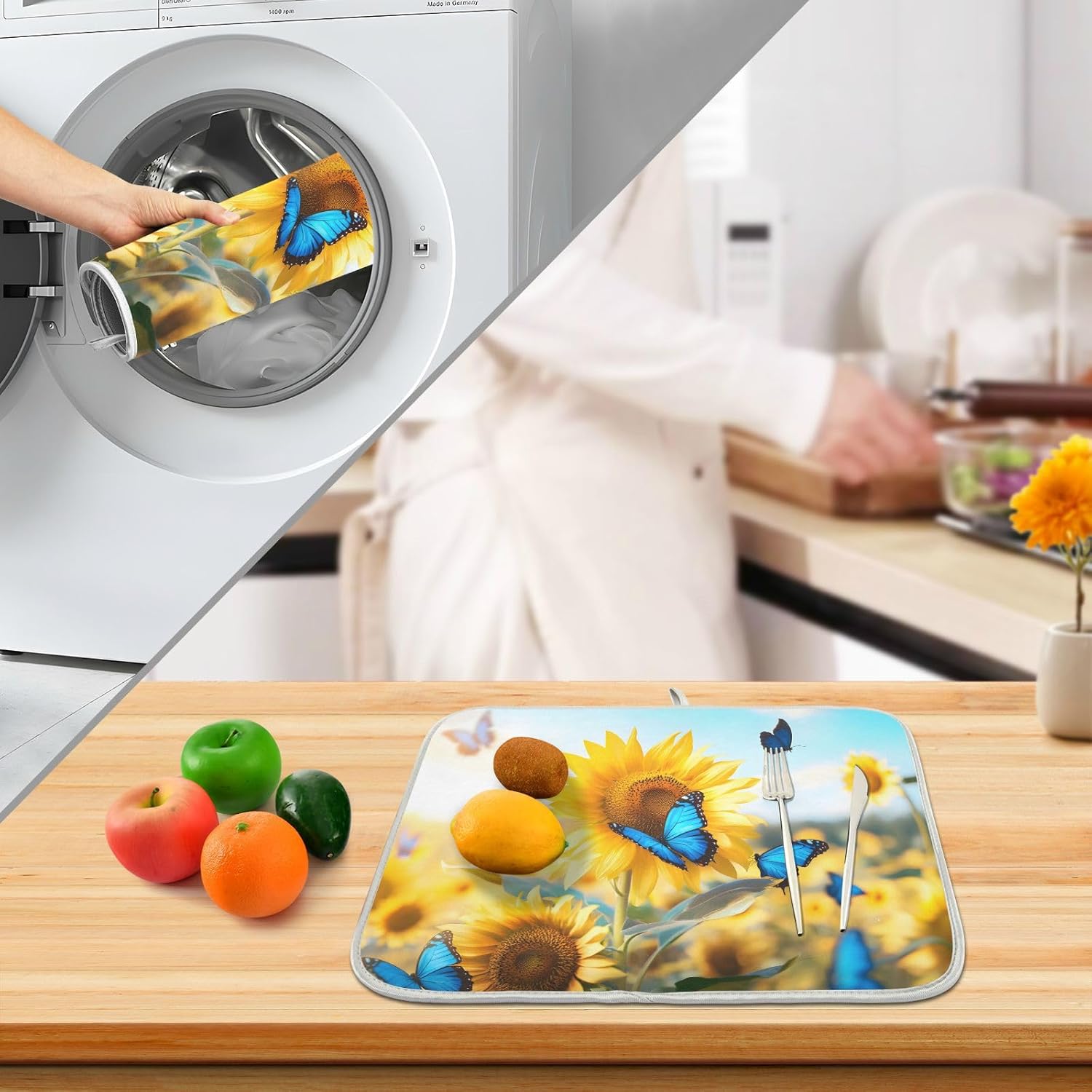 Blooming Sunflowers Blue Butterfly03 Dish Drying Mat for Kitchen Counter Absorbent Microfiber Small Drying Pad Dish mats for Kitchen Countertops 16 x 18 Inch