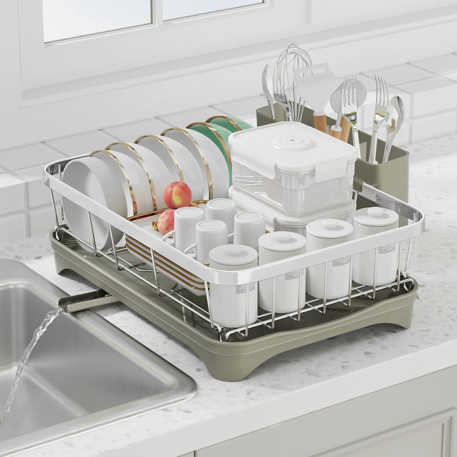 - Auto - draining Drainboard :Featuring central drainage holes and adjustable spout, the dish drying rack ensures that water drains directly into the sink, keeping your countertop dry. You can position the rack adjacent to the sink in the most convenient way for your setup.