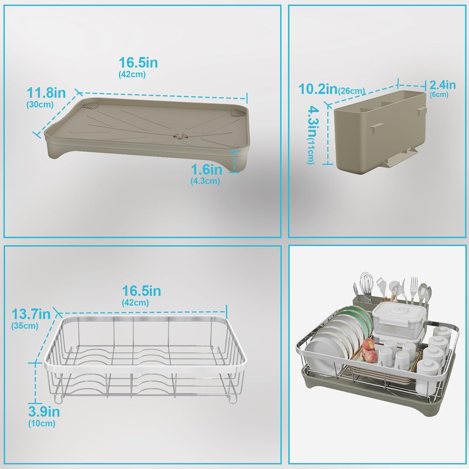 - Compact Size Dish Rack :The utensil drying rack measures 16.5"L x 12"W x 5.3"H. Despite its compact dimensions, it offers ample space to hold over 10 items of various sizes, such as bowls, glass bottles, and spice jars. This makes it an ideal choice for saving countertop space.