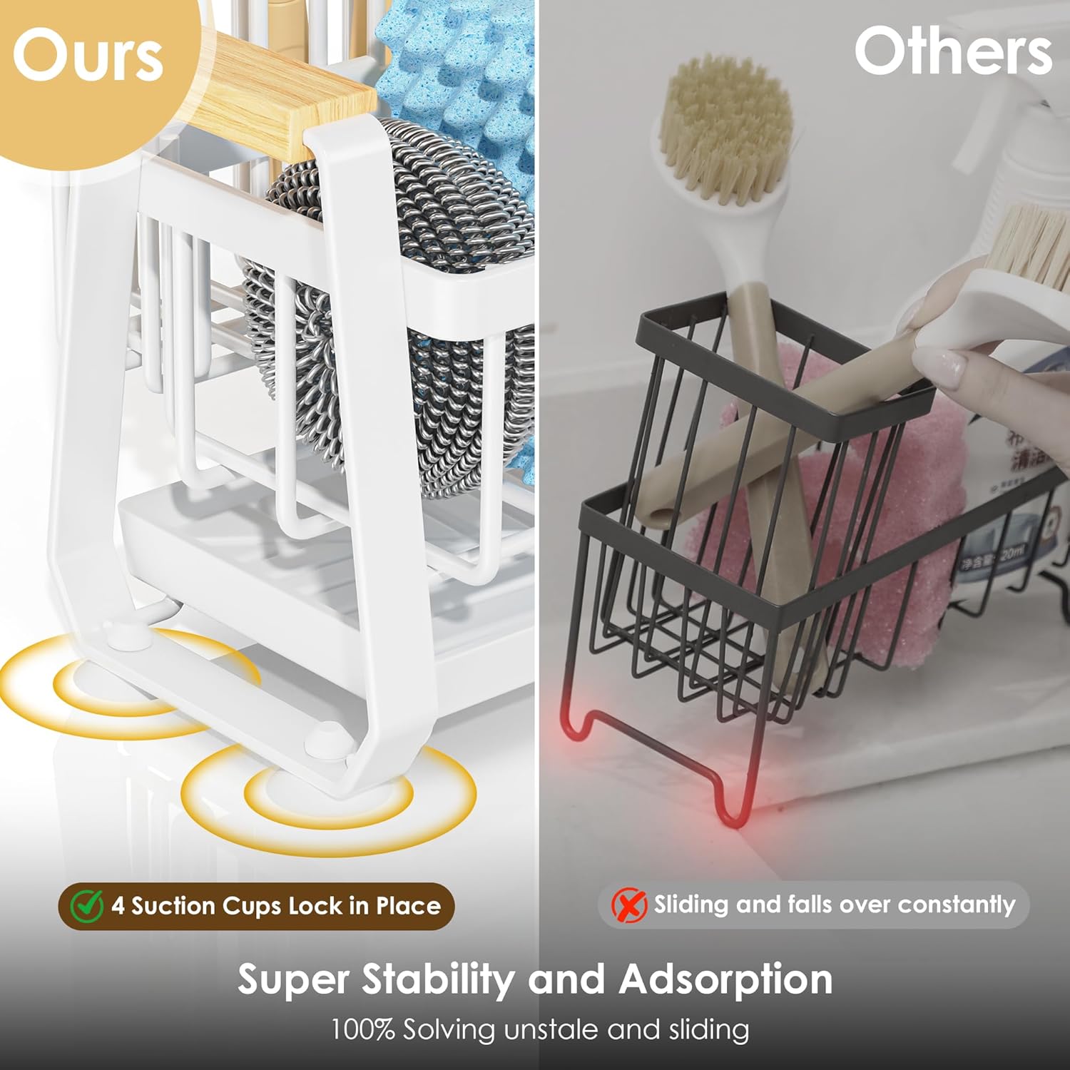 - 【Shake-Proof Stability】Stays put through chaos,four industrial-strength rubber suction cups grip like a gecko, ensuring shake-proof stability on marble, granite, or glass-no slips, no falls, even when scrubbing fiercely or kids crash into the kitchen countertop!