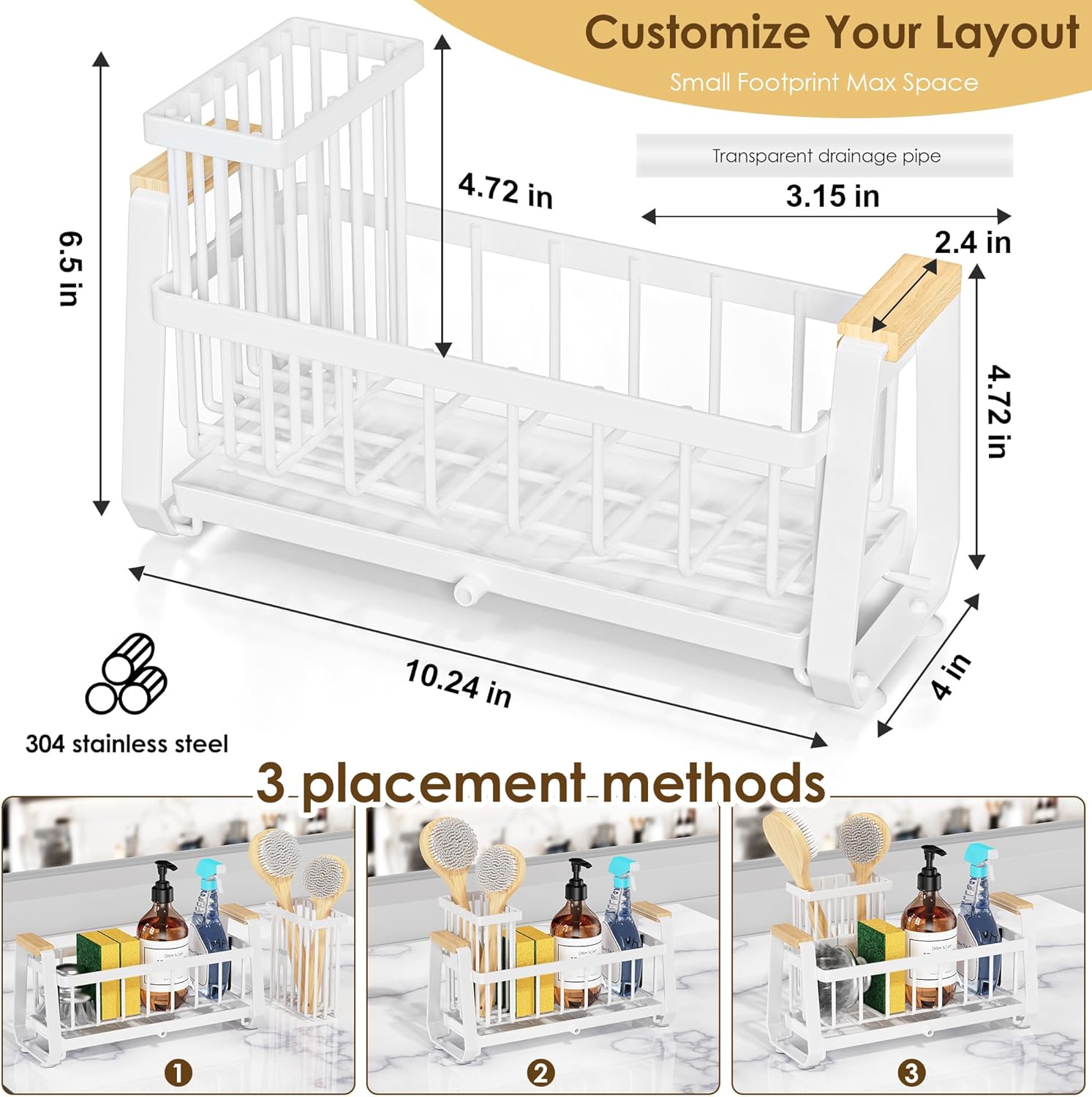 - 【Small Footprint Max Space】Our kitchen countertop organizer has upgraded the height of the brush rack storage part and adopts a unique engineering design. It measures only 10.24"*4"*6.88",the same size can hold 30% more capacity than standard racks,and can flexibly hold more detergent bottles ,types of brushes and other items. No more choosing between‘sponges or detergents’like others!