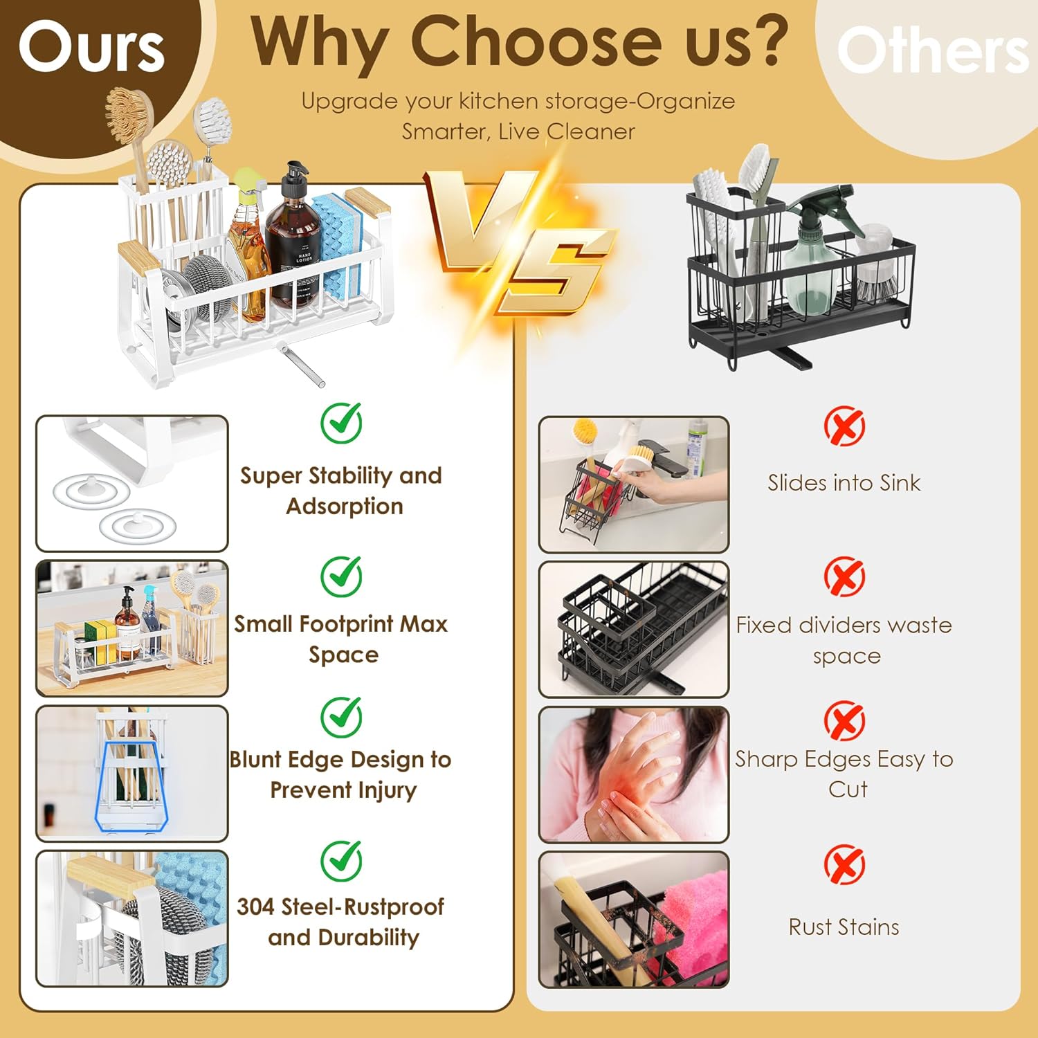 - 【304 Stainless Steel】Doasuwish kitchen sink organizer is made of 304 stainless steel.Rustproof and stays like new-Lab tested to resist rust, stains, and fingerprints. Unlike other sink caddy that corrode and stain your countertops, ours stays pristine even in humid kitchens. Just rinse & go-no maintenance!