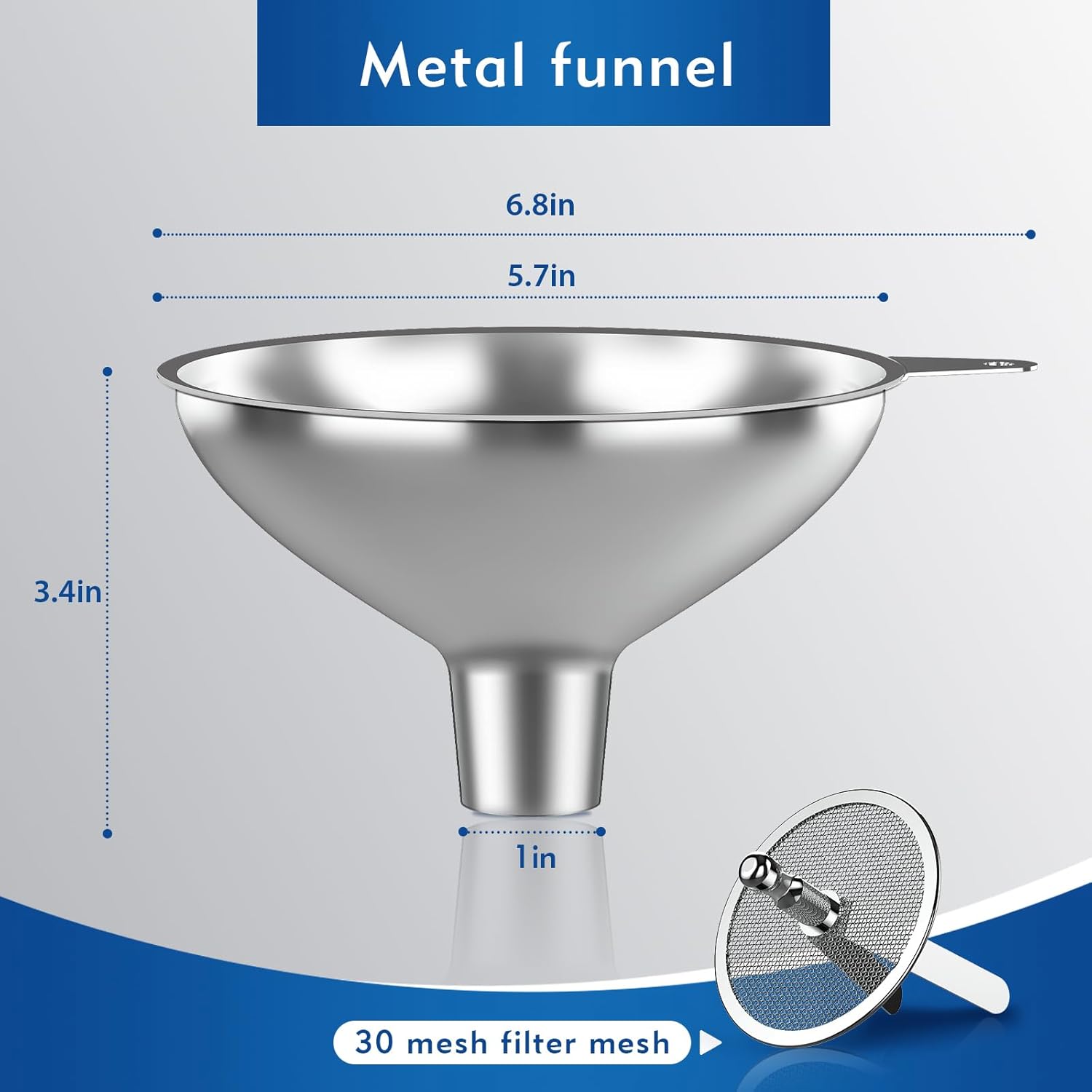 Stainless Steel Funnel with 30 Mesh Filter Food Grade Metal Funnel for Kitchen, Liquids, Oil, Powder, Wide Mouth Bottles, Home Brewing