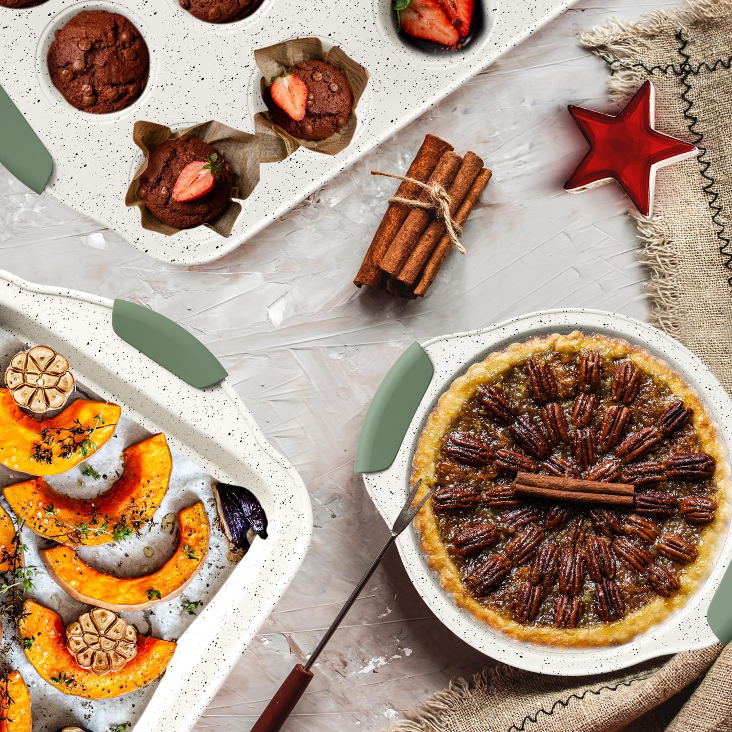 11-Piece Non-Toxic Baking Set, Stackable Nonstick Cookware with Heat-Resistant Handles - Includes Cookie Tray, Round Cake Pan, Muffin Cups, Pizza Pan & Loaf Baker, White&Light Green