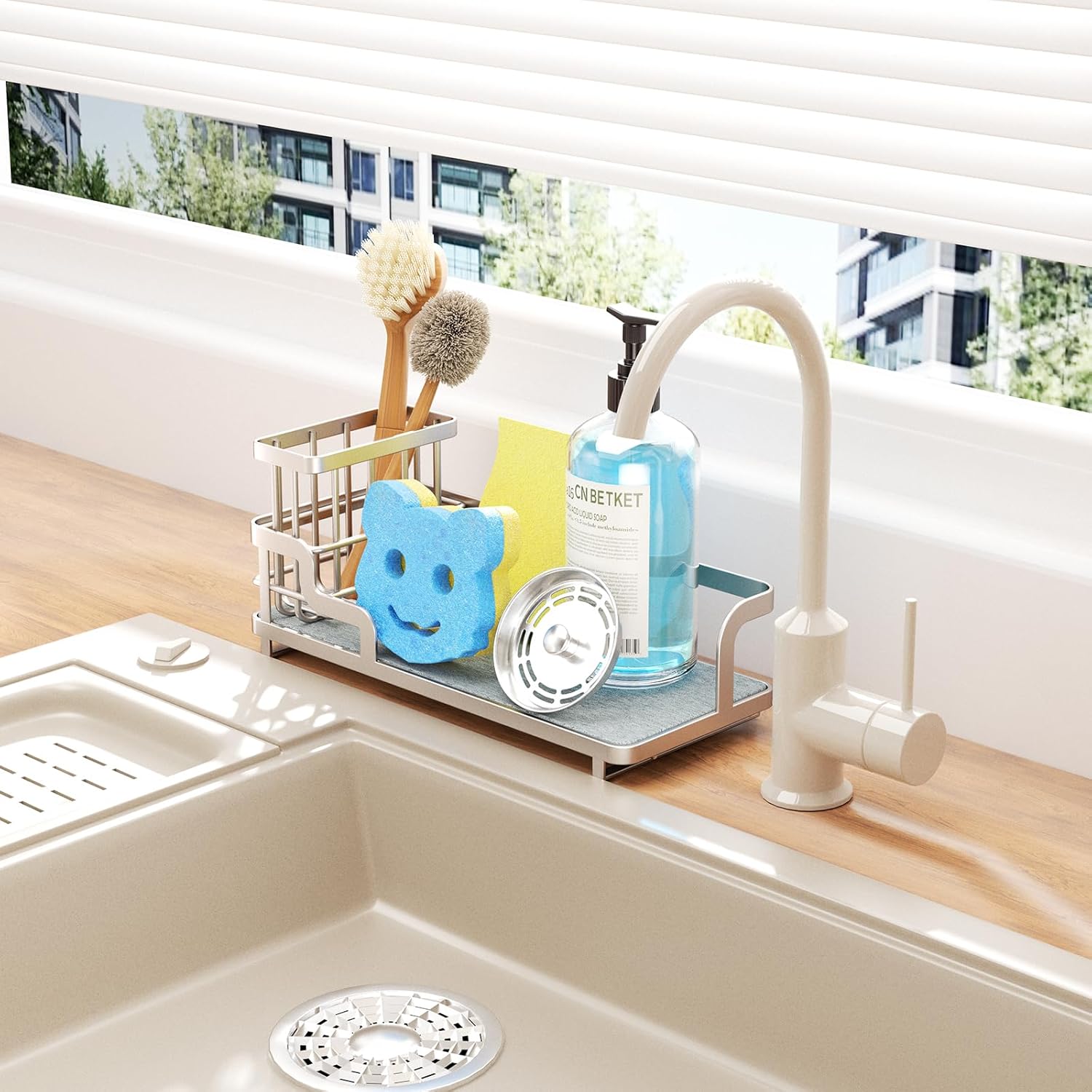 - [Fast Water Absorption and Drying]: Equipped with a sink caddy sponge holder featuring a diatomite base, it quickly absorbs water and dries fast, preventing water spots and odors, while keeping your items dry