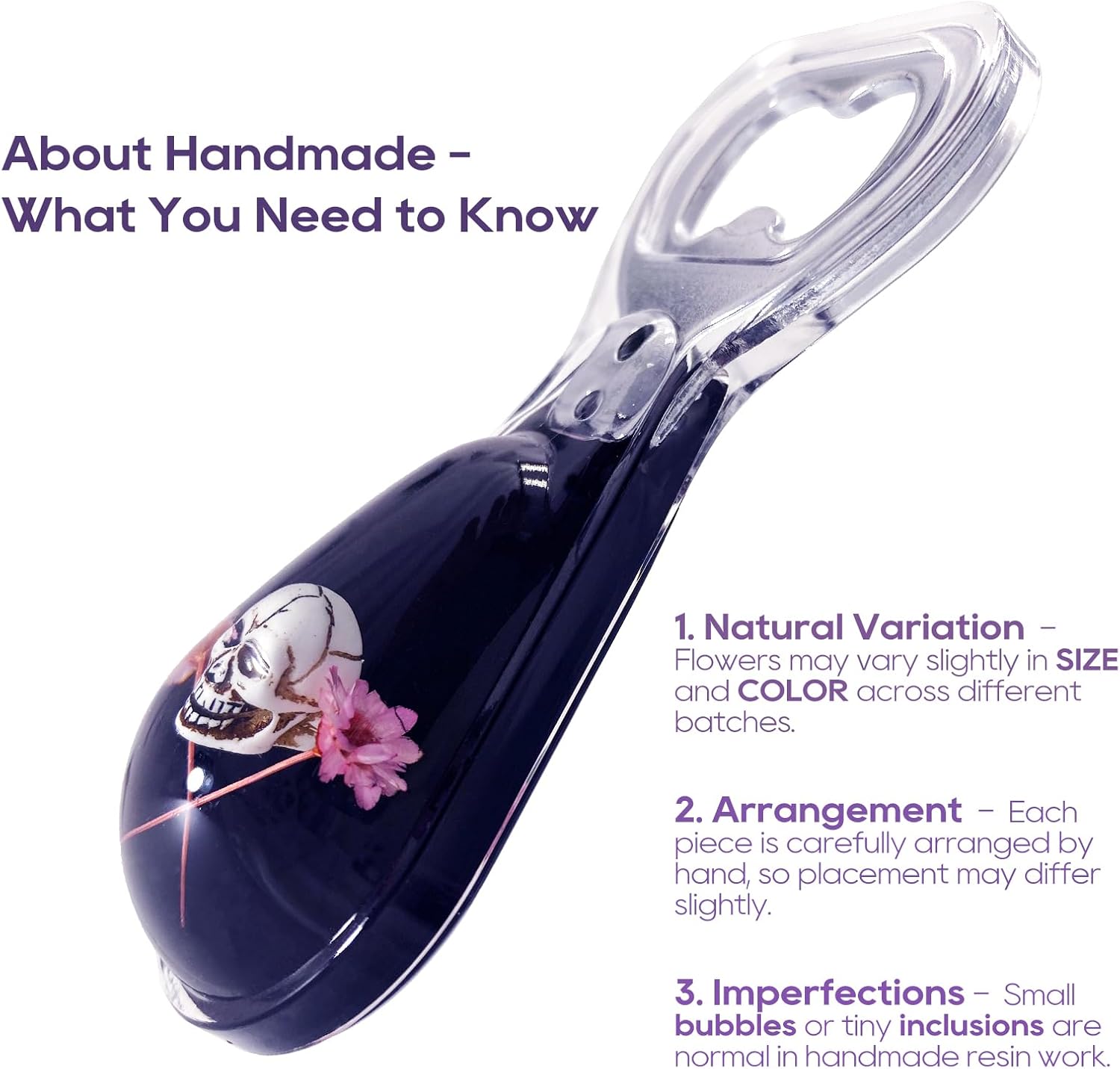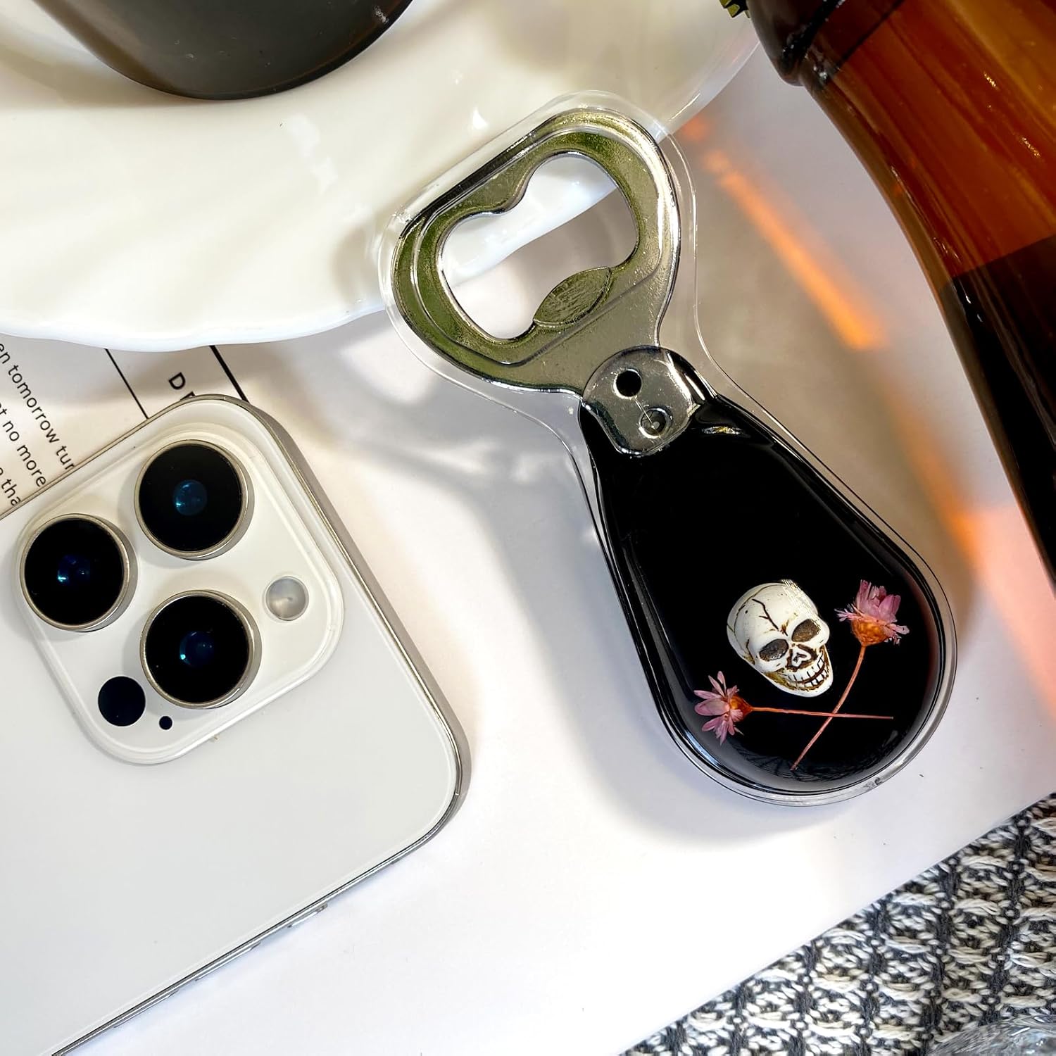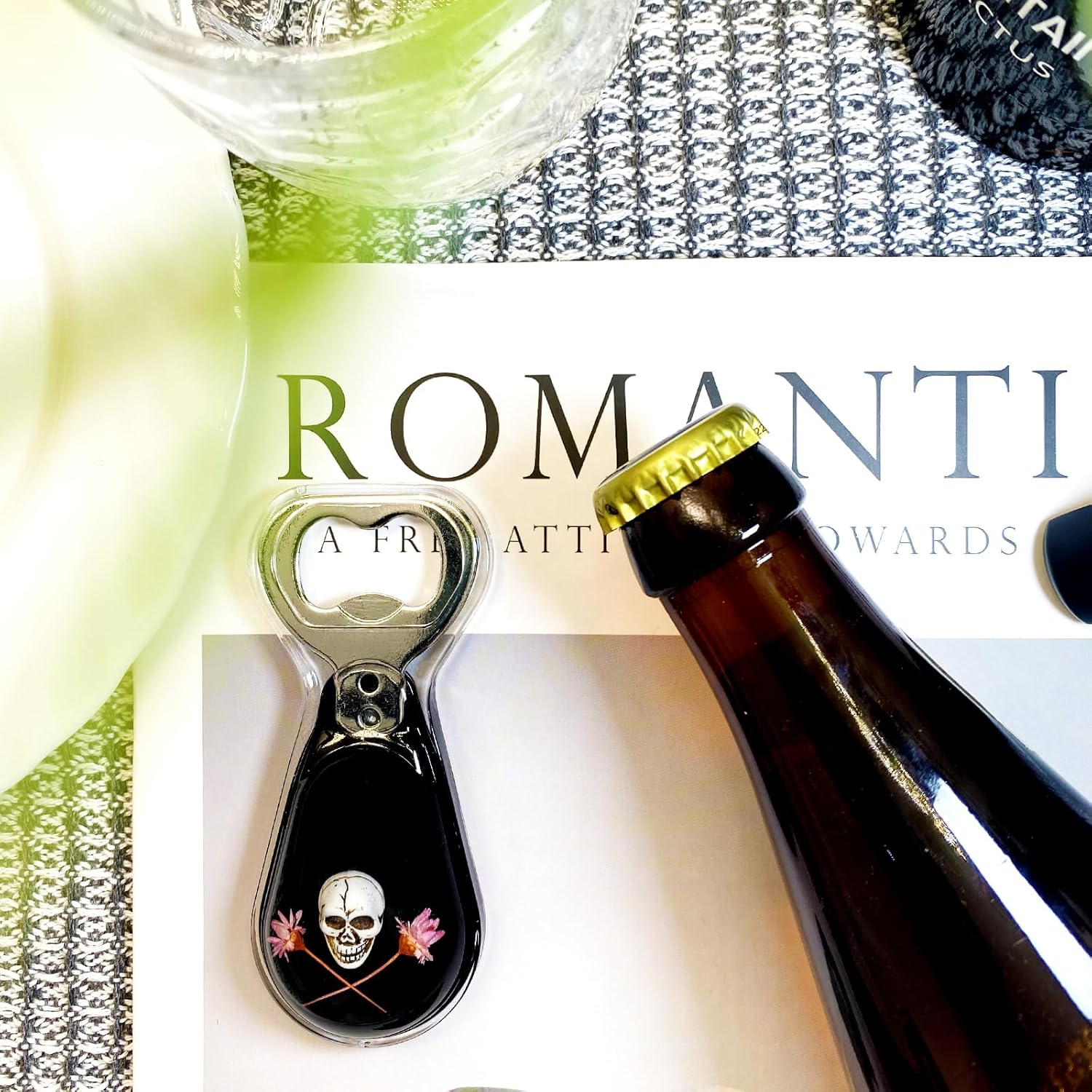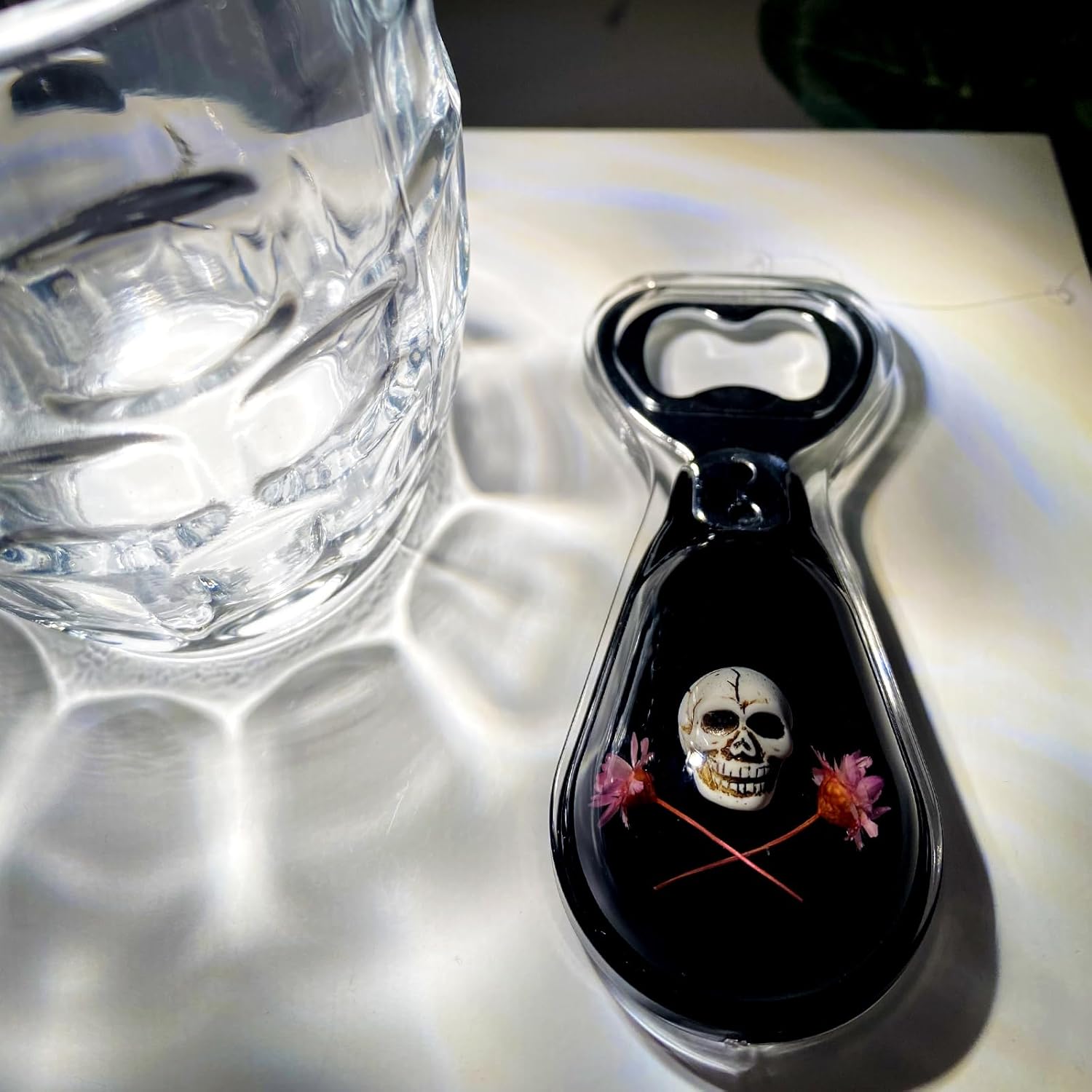 Halloween Ghost Skull Decor, Magnetic Bottle Opener, Original Design Skull Flower in Black Resin – Strong Magnet for Fridge – – Gothic Halloween Gifts - Midnight Black