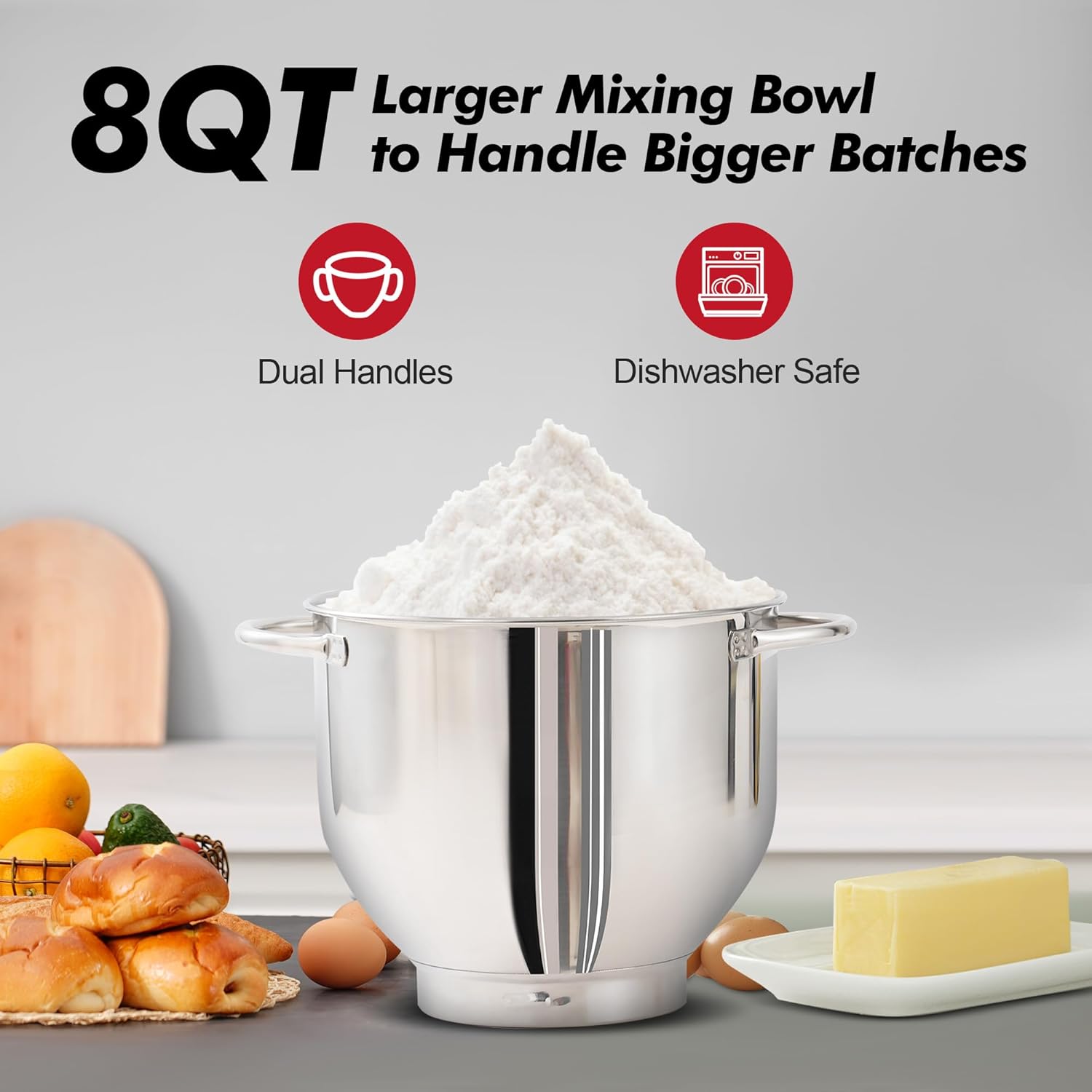 - 8QT Large Capacity Bowl With Handles - 8QT Stainless steel bowl can meet all your kitchen needs. The Stand Mixer is easy to use for making cakes, breads, cookies, pastry, muffins and waffle, and the dual handles are more convenient to hold.