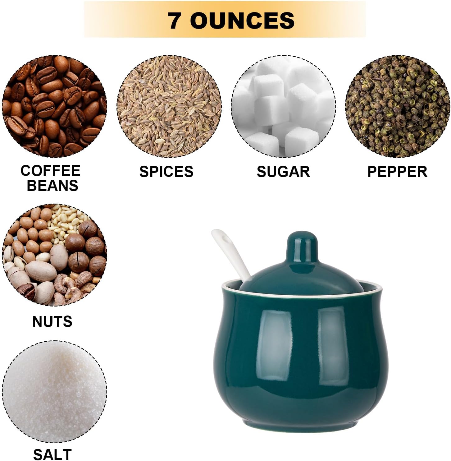 Ceramic Sugar Bowl with Lid and Spoon, Green Porcelain Sugar Salt Pepper Storage Jar, 8 Ounces