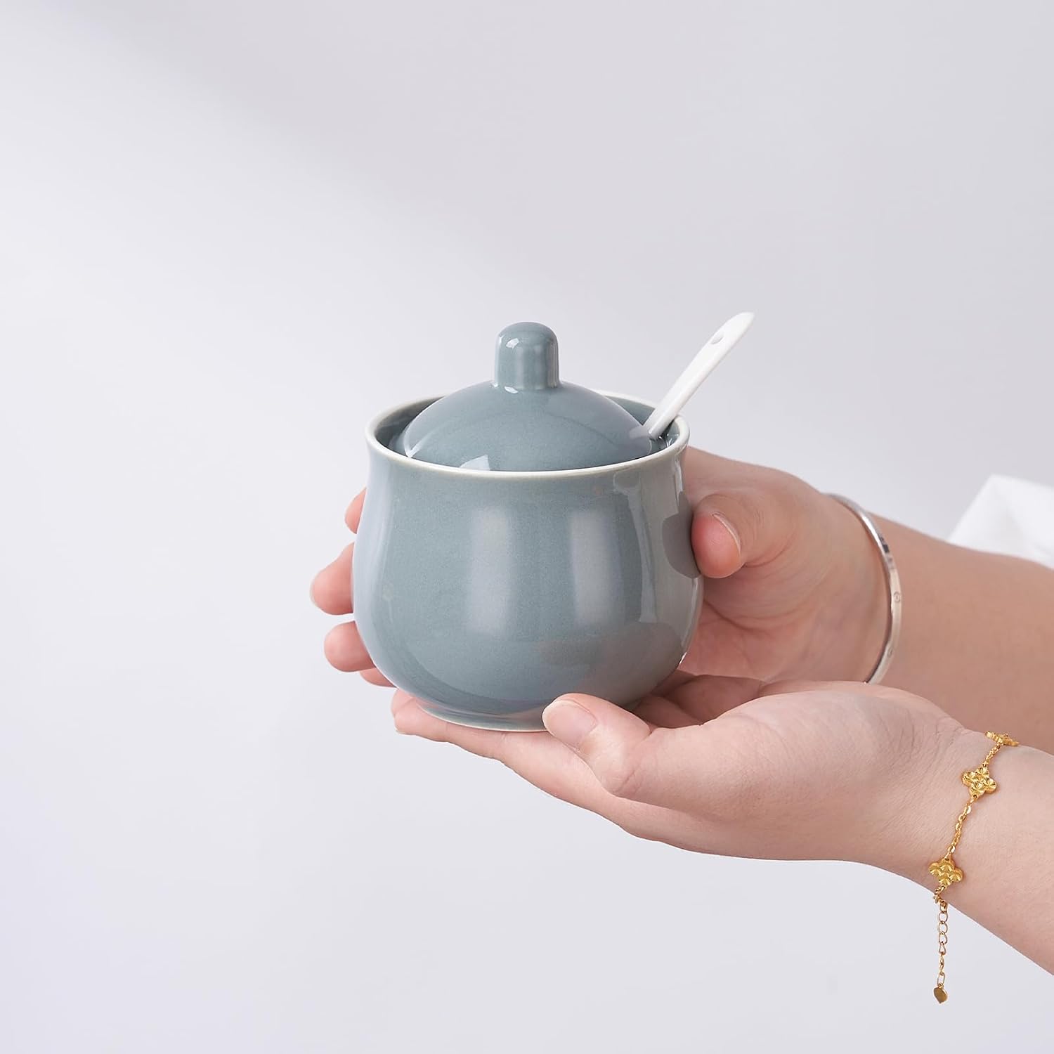 Ceramic Sugar Bowl with Lid and Spoon, Grey Porcelain Sugar Salt Pepper Storage Jar, 8 Ounces