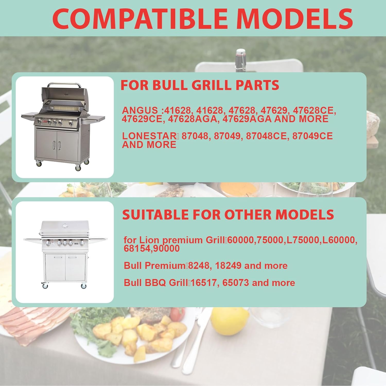 - Compatibility: Designed specifically for Bull Grill 4 Burner 30 Inch Angus 47628 41628 41629 47628AGA 47629AGA 47629CE 47628CE and more,for Bull Premium Grill 18248 18249 etc., for Bull Outlaw Grill 26039 26039CE 26038 26038CE and more, for Bull Lonestar Grill 87049 87049CE 87048 87048CE and more,compatible with the original Bull part number 16517 65073 and more.
