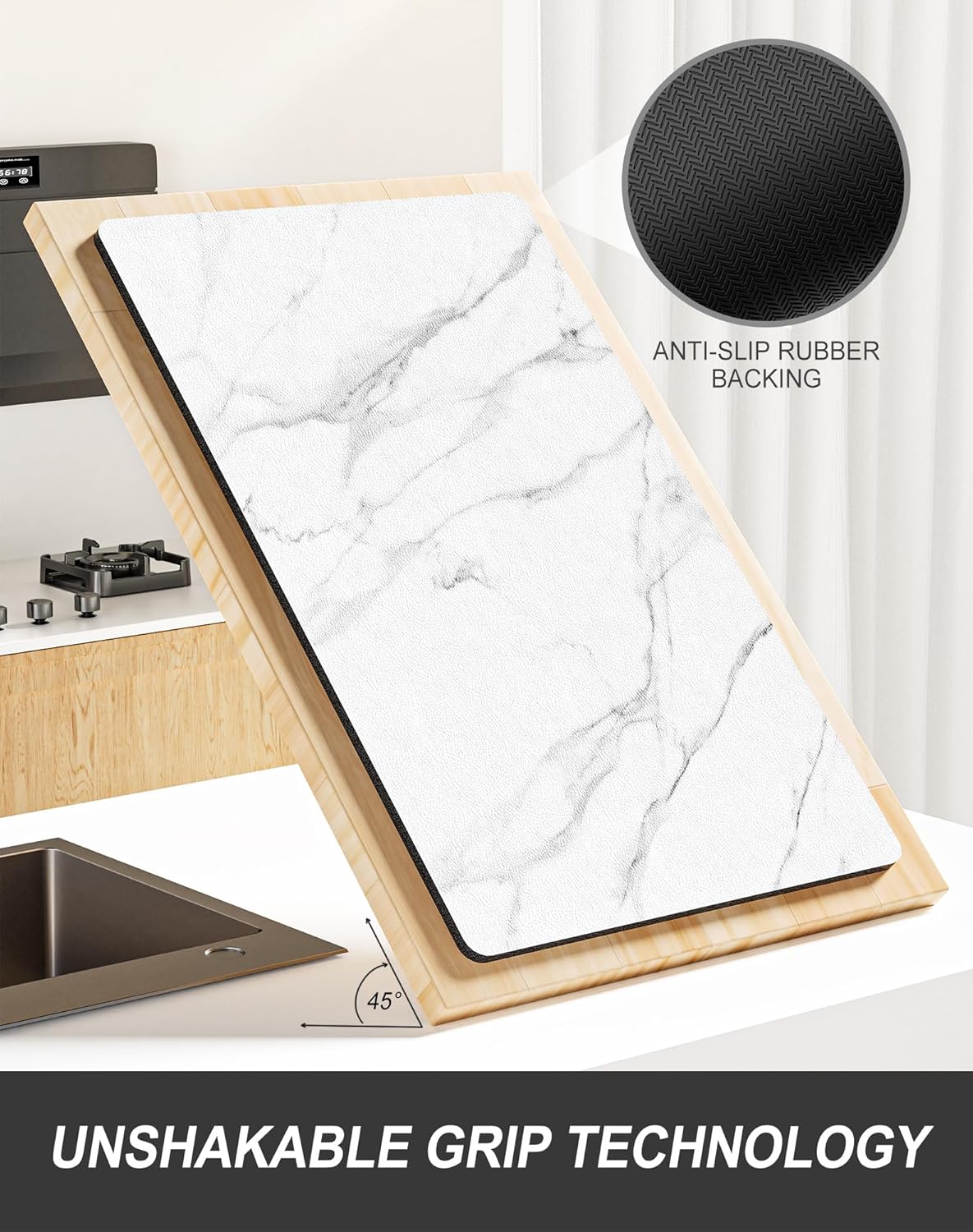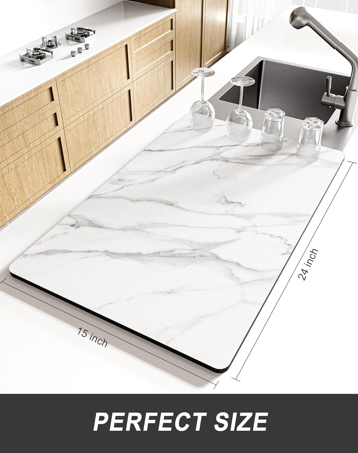 Rnivvi Dish Drying Mat for Kitchen Counter, XL 15 x 24" Cute Marble Super Absorbent Draining Pad, Non-Slip Heat Resistant Coffee Bar Mats for Coffee Machine Station Accessories, White Dish Rack Pad