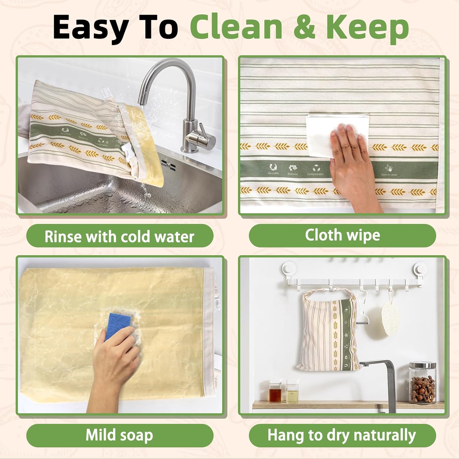 - 【EASY CLEAN BEESWAX BREAD BAGS】Maintaining the quality of our beeswax bread bags is simple and straightforward. To clean, just turn the bag inside out for easier access to all surfaces. Gently rinse it with cold water and a few drops of dishwashing liquid. Avoid using hot water or machine washing, as these can compromise the integrity of the beeswax layer. Once cleaned, allow the bag to air dry completely before storing or using it again