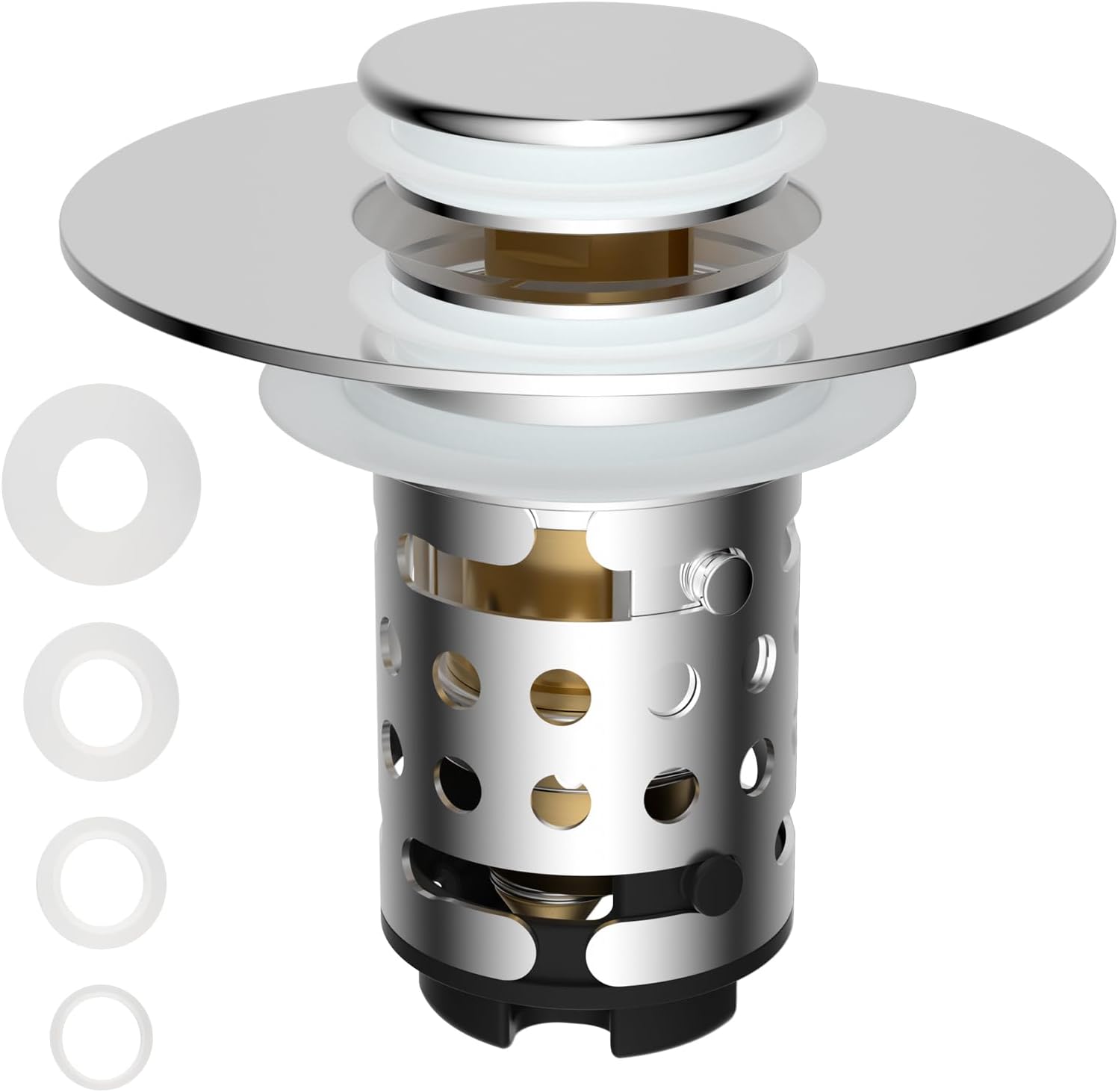 - Practical Stylish Design: Made of high-quality stainless steel and brass with a sleek Chrome finish, it fits well with most bathroom fixtures and decor styles; This sink stopper is tough, crack-resistant, and resists tarnishing, designed for a long time use
