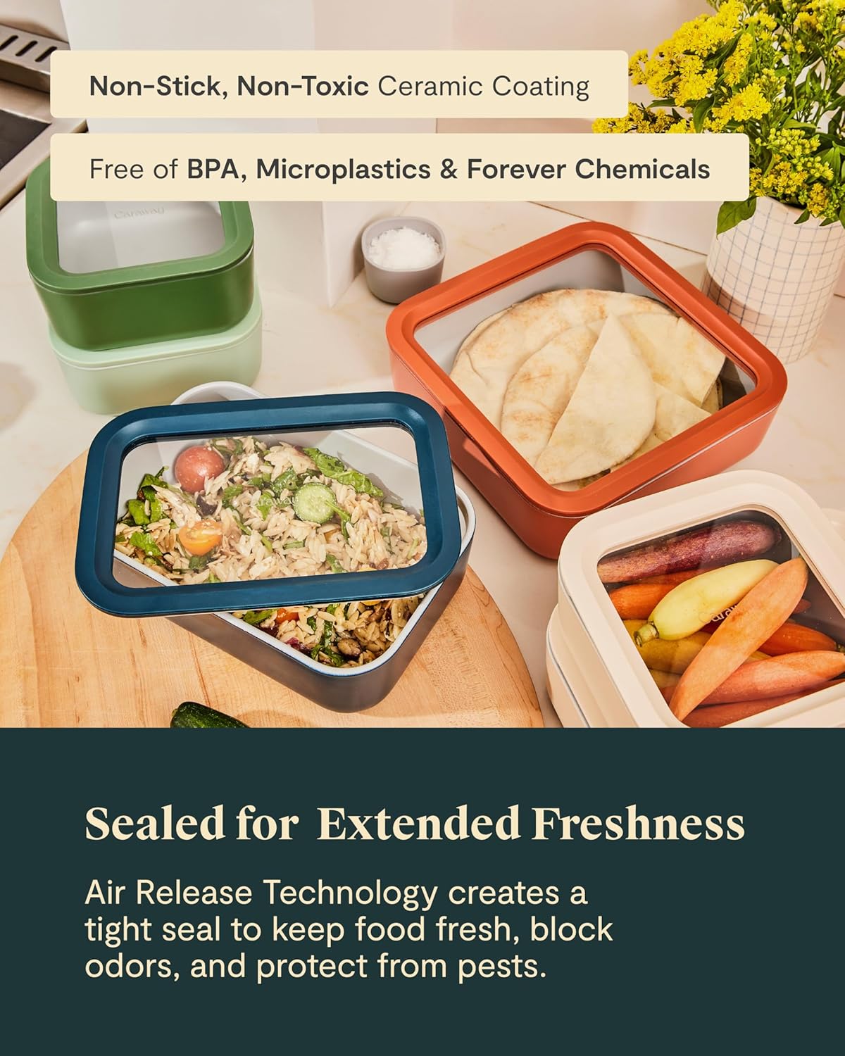- KEEP YOUR FOOD FRESH: Look forward to leftovers with Caraway’s easy-to-store, non-toxic food storage containers. This set looks great and most importantly keeps your food extra fresh and organized.