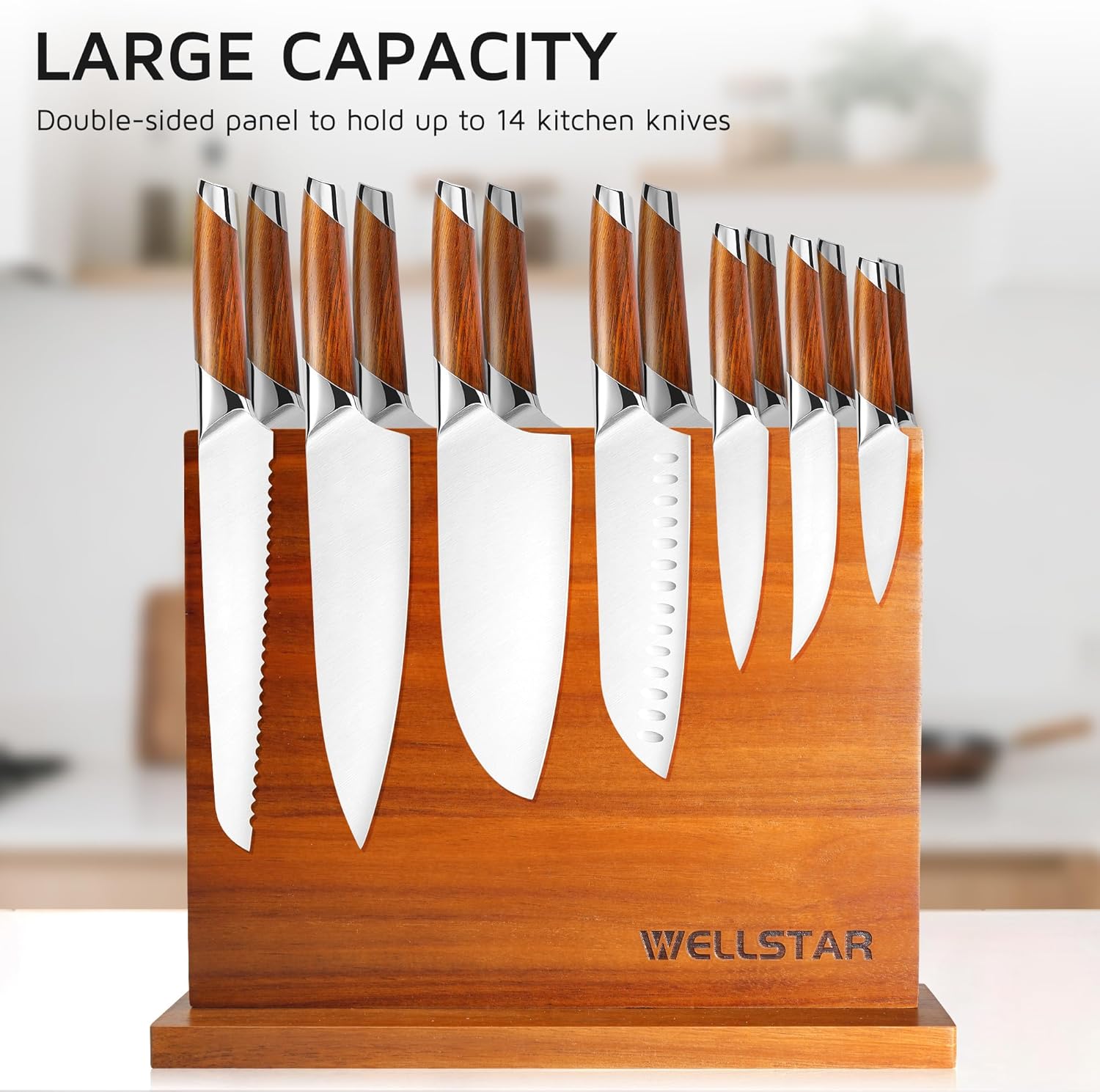 - [Acacia Elegance: Where Aesthetics Meet Functionality] Our Magnetic Knife Block Holder is a testament to the fusion of style and utility, flaunting a dual-sided design that gracefully organizes your kitchen knives. The exquisite acacia wood exterior infuses a refined warmth into your decor while promising durability and effortless maintenance.