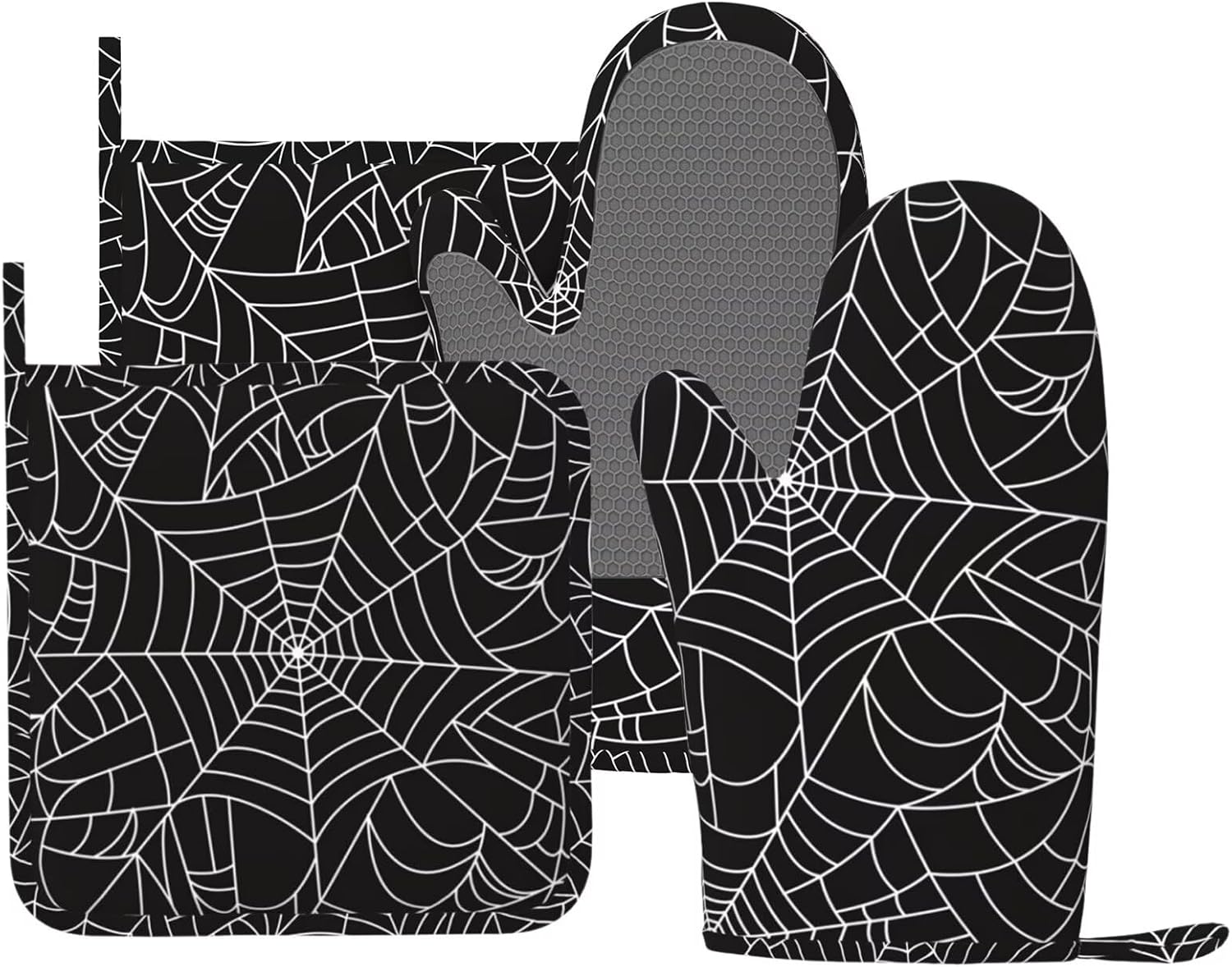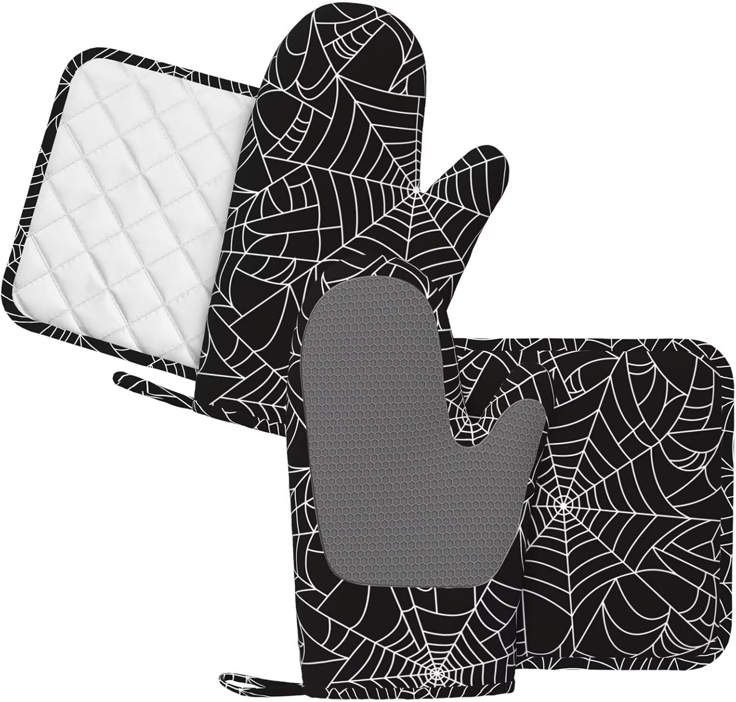 - HEAT RESISTANT: The black and white spider web silicone oven mitts and non-slip pot holders set are heat resistant at 392 F/200 C because of their durable construction so they can effectively keep you protected from burning while you enjoy cooking and grilling