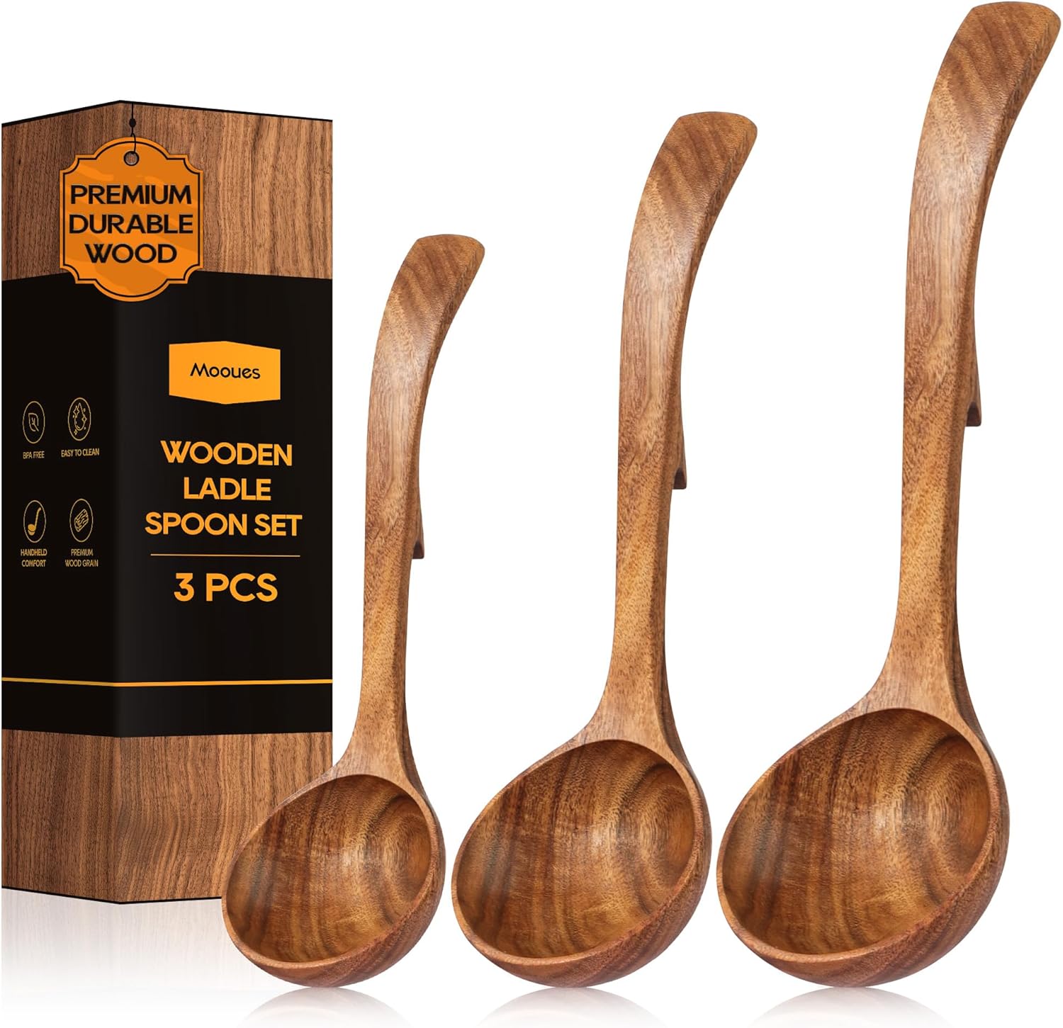 Wooden Ladle for Soup, 3 Size Teak Wood Ladle Spoon with Back Hooks, Heat Resistant Wooden Spoons for Cooking, Non-Stick, Comfortable Grip, Wood Kitchen Utensils Set for Serving, Stirring
