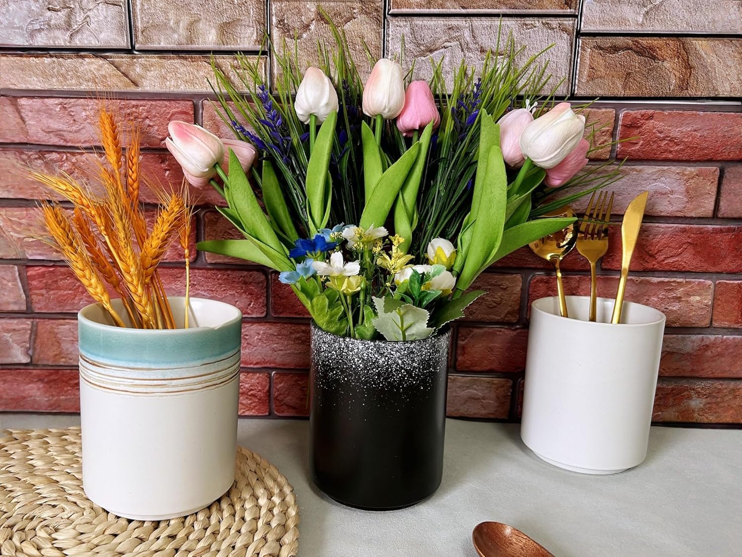 Medium Stoneware Kitchen Utensil Holder for Kitchen Counter Short Cooking Utensil Holder for Countertop Spatula Holder Small Utensil Crock Cutlery Holder Silverware Caddy Flower Vase (White)
