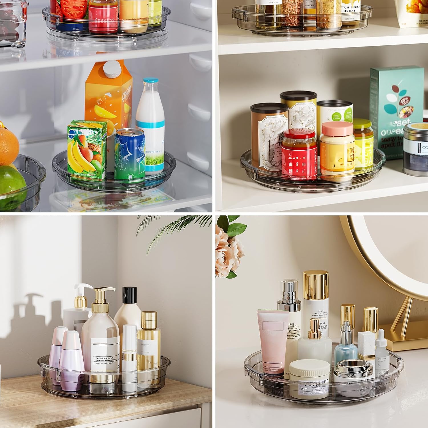 - Versatile Use and Space Saving: This Lazy Susan organizer is great for cabinet, kitchen countertop, fridge and pantry organizers and storage, keeping condiments, snacks, cans neatly. it's also a medicine cabinet organizer, spice organization for cabinet, bathroom makeup perfume spinning organizer. Elevates the functionality and efficiency of every space