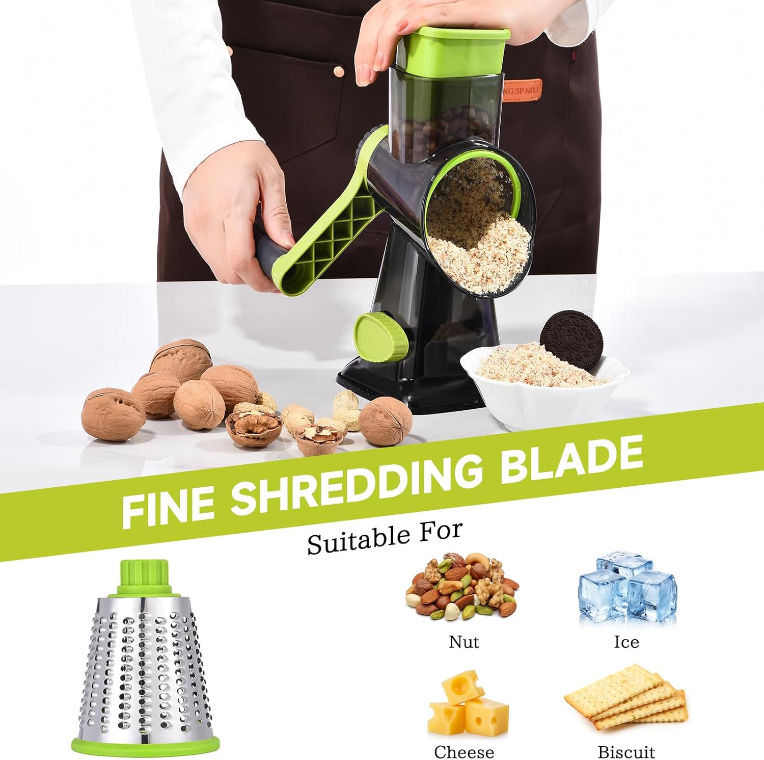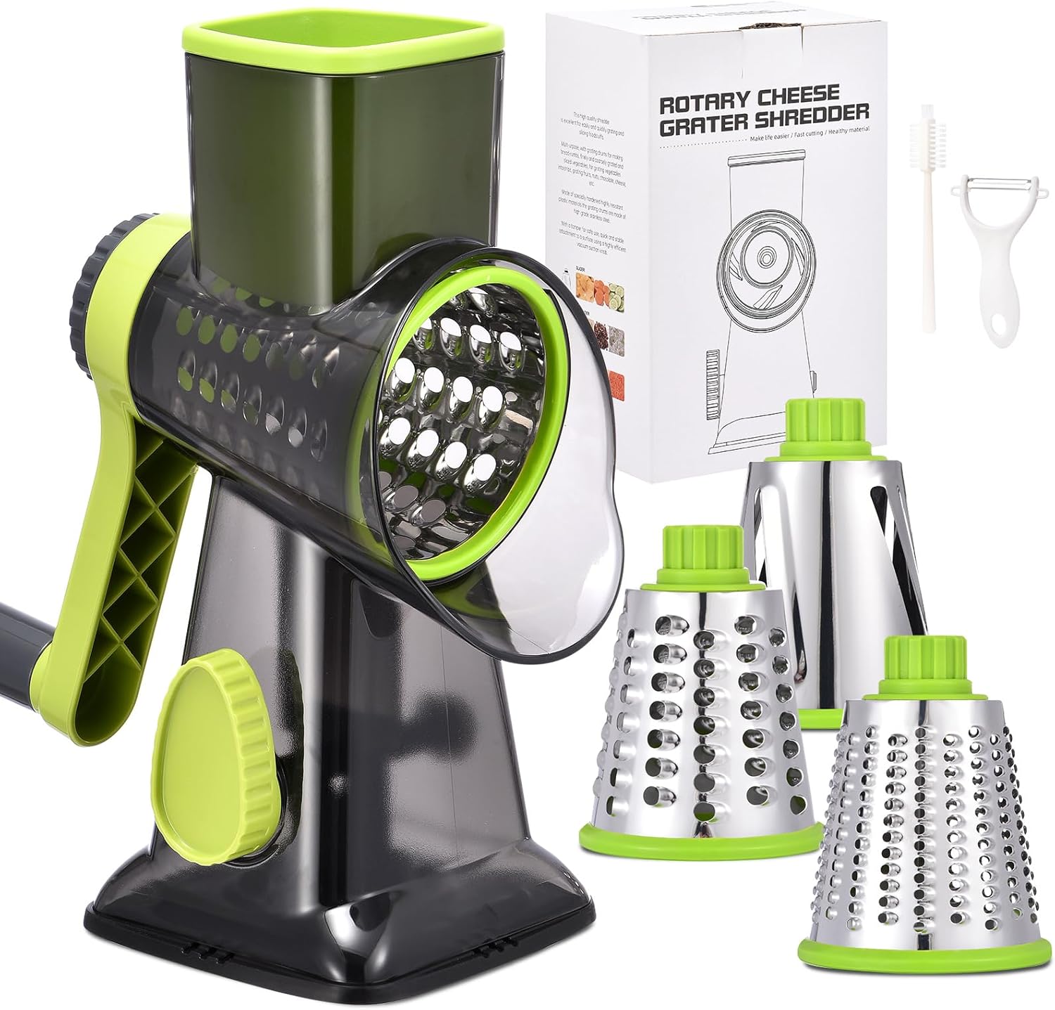 - 【Grater for Kitchen】: 【3-IN-1 cheese shredder】With 3 drum blades for slicing,shredding,and grinding various ingredients;Perfect for cheese, carrots,cucumbers,potatoes,broccoli, chocolate,salads and pizza toppings;Use slicing/coarse for soft cheese,fine for hard cheese.