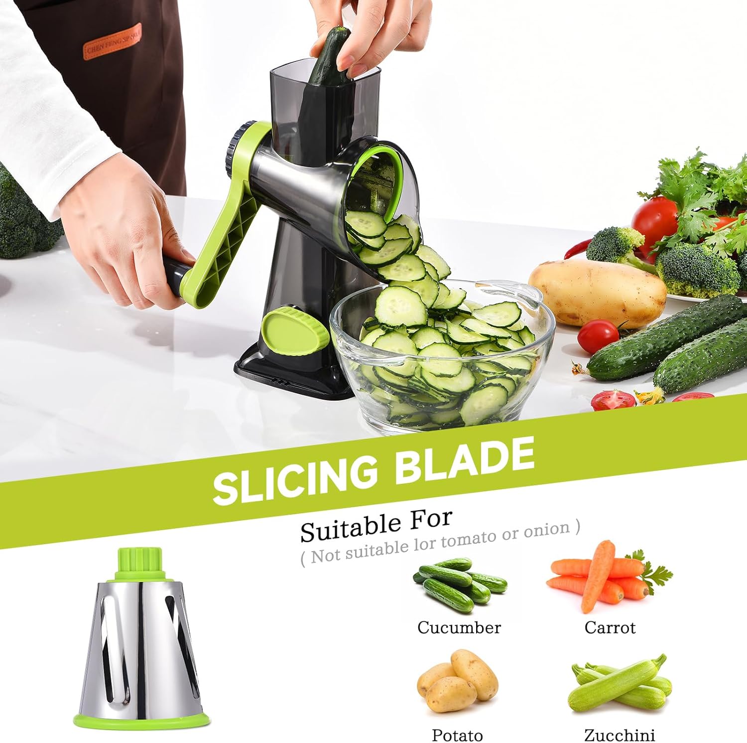 - 【Humanized Design】: Reasonable drum-type rotating vegetable shredder has powerful suction feet for stability on your table. The rotary cheese grater with handle is very efficient and easy to operate! The parts can be easily disassembled, It also saves storage space and makes your kitchen cabinet less crowded.