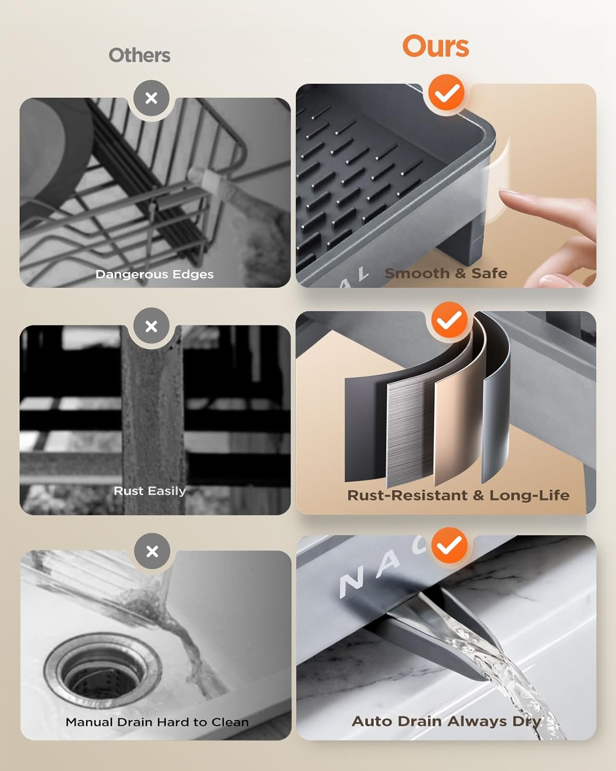 - Adjustable Height, Perfect Fit: Nacial sink sponge holder features a detachable base with customizable height, adapting to any sink. Unlike conventional sponge holders posing cut risks, Nacial enforces precision-rounded guards that eliminate injuries.Critically, while other organizers trap moisture leading to rust, Nacial 304 stainless steel & auto-drain desgin ensures lasting dryness through rapid drainage. Get your Nacial, Your indispensable kitchen essential