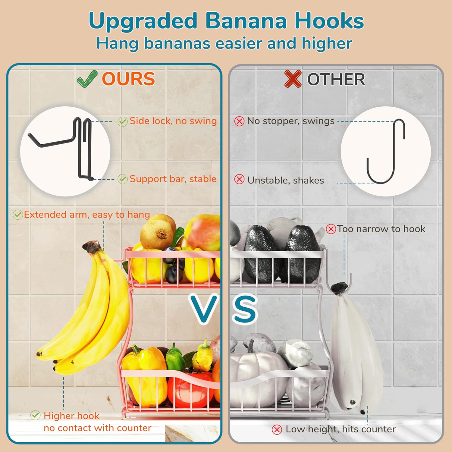 - Banana Hangers: Includes two detachable banana hooks for higher, better hanging