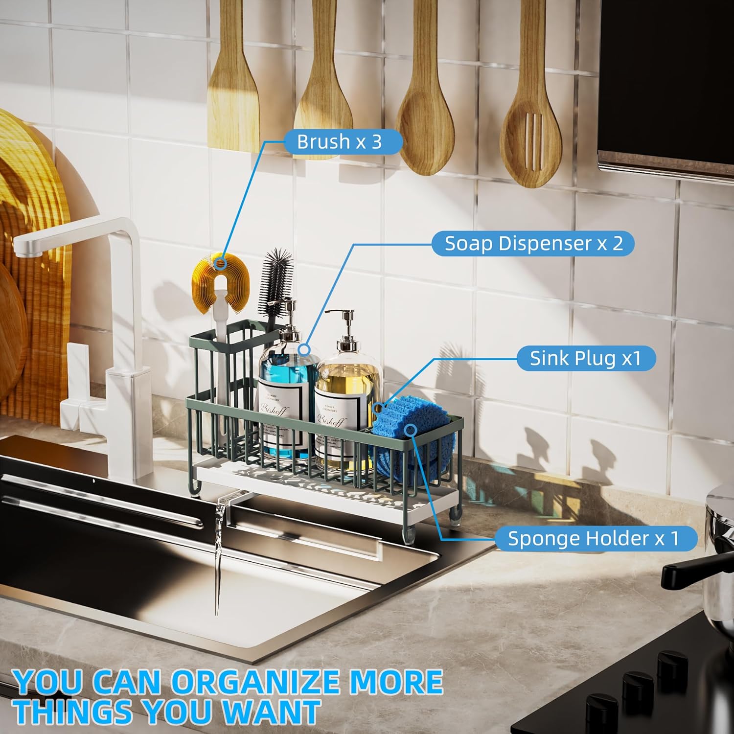 Moforoco Extra Large Sponge Holder for Kitchen Sink Organizer Caddy, Dish Brush Scrubber Holder,Stainless Steel Sink Box Utensil Holder,Soap Dispenser Set Tray Counter Accessories(Sage Green )