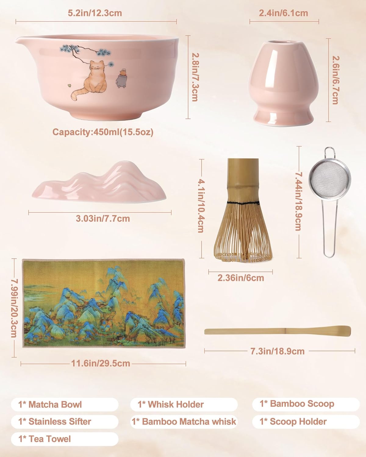 - 7-PCS MATCHA WHISK SET: 1*Ceramic Bowl whith Spout(chawan) 450 Ml/15.22 Oz, 1*Bamboo Whisk, 1*Bamboo Scoop (chashaku), 1*Cermaic Whisk Holder, 1*Ceramic Scoop Stand, 1*Cotton Tea Cloth (chakin), 1*Matcha Powder Sifter.Includes All Accessories.Elevate your tea ritual with our thoughtfully curated collection, perfect for both enthusiasts and newcomers to the world of matcha.