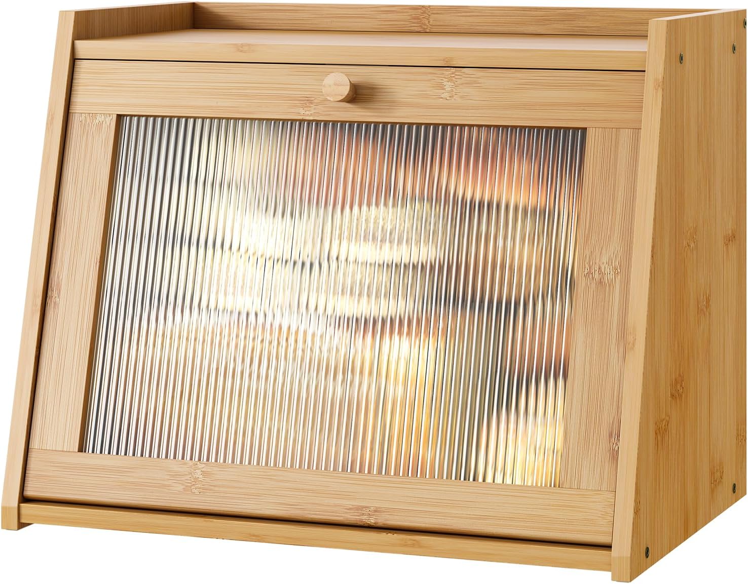 Large Bread Box for Kitchen Counter, Bamboo Bread Storage Container with Wavy Arcylic Transparent Door, Bamboo Wooden Farmhouse Bread Box for Your House