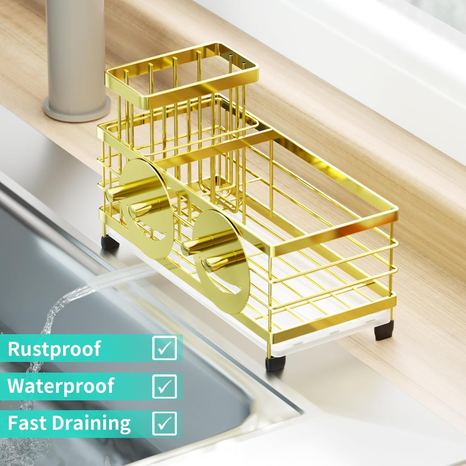 HapiRm Sink Caddy Sponge Holder - Self-draining Kitchen Sink Organizer with Smiley Face and Brush Holder, Stainless Steel Kitchen Sponge Caddy for Countertop - Gold