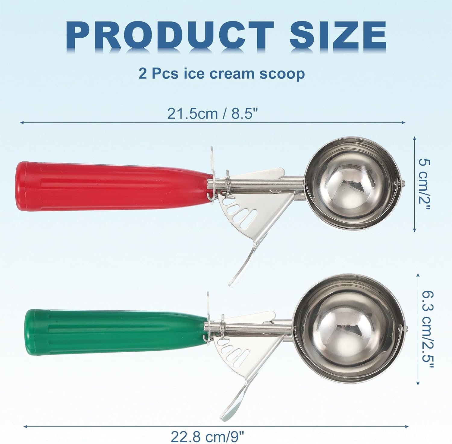 - Package Included - 2 Pcs x ice cream scoop; Length: 21.5 cm/8.5 inch; Width: 5 cm/2 inch, 6.3 cm/2.5 inch; Great for housewarming gifts, holiday gifts.