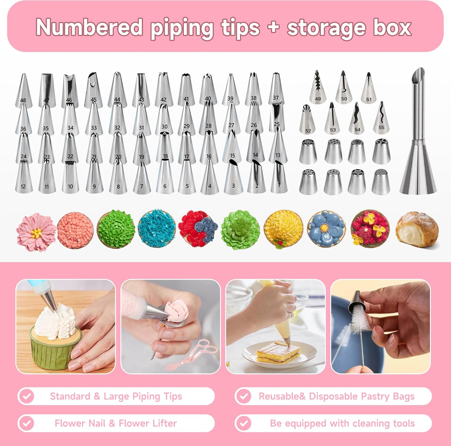 - PATTERN CHART&E-BOOK: This cake decorating kit is FUN FOR ALL AGES AND SKILL LEVELS,This set having numbered tips with Pattern chart. So you don't have to worry about which tips produce what kind of decoration, just have a look on pattern chart where we have provided outcome of each tip to make tip selection,E-Book user guide includes The Cake Decorating Project offers four levels,Each step Method of Cake Baking, Leveling & icing cakes, 3 frosting recipes, Step by step guide for using icing