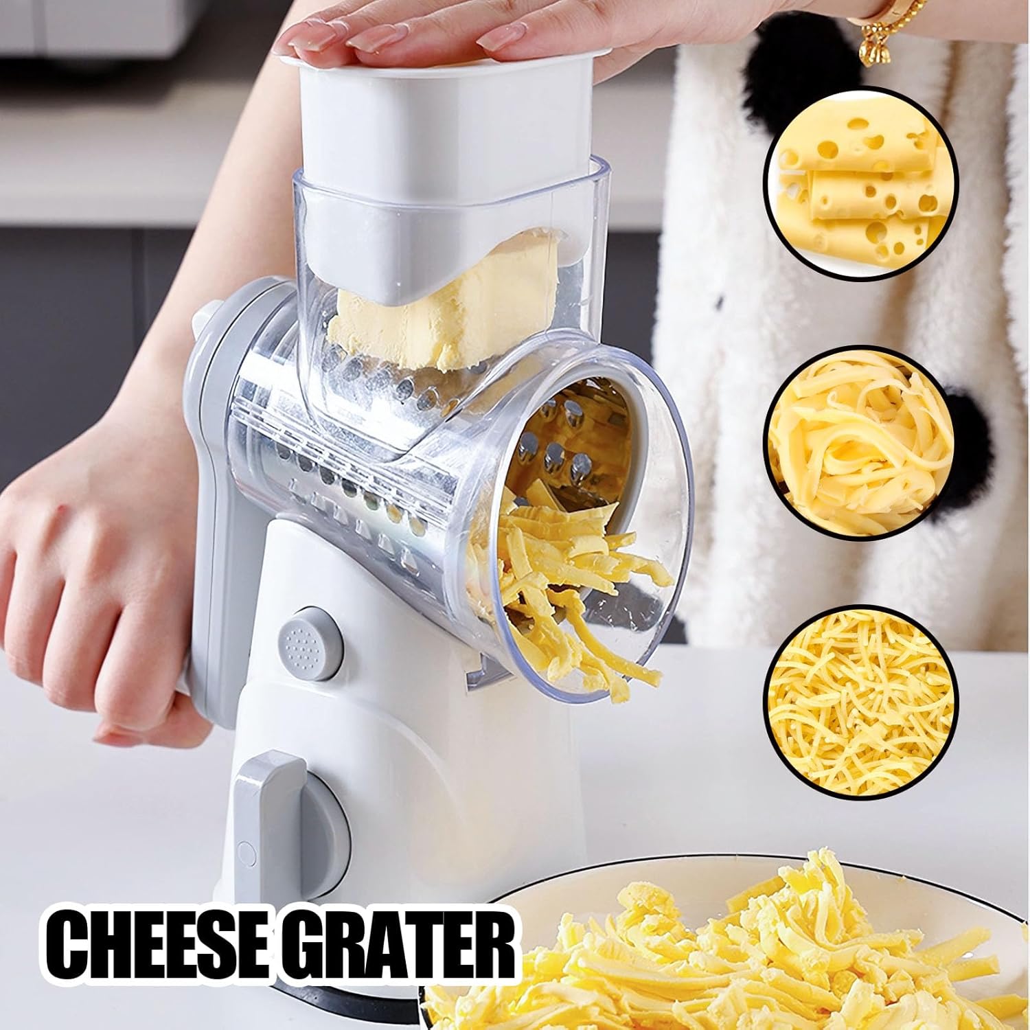 - Humanized Design: The drum-style rotating vegetable grater is equipped with a powerful suction cup base to ensure stable placement on the table. The handle-equipped rotating cheese grater is efficient and easy to operate! Components can be easily disassembled for convenient and simple cleaning. It also saves storage space, keeping your kitchen cabinets clutter-free