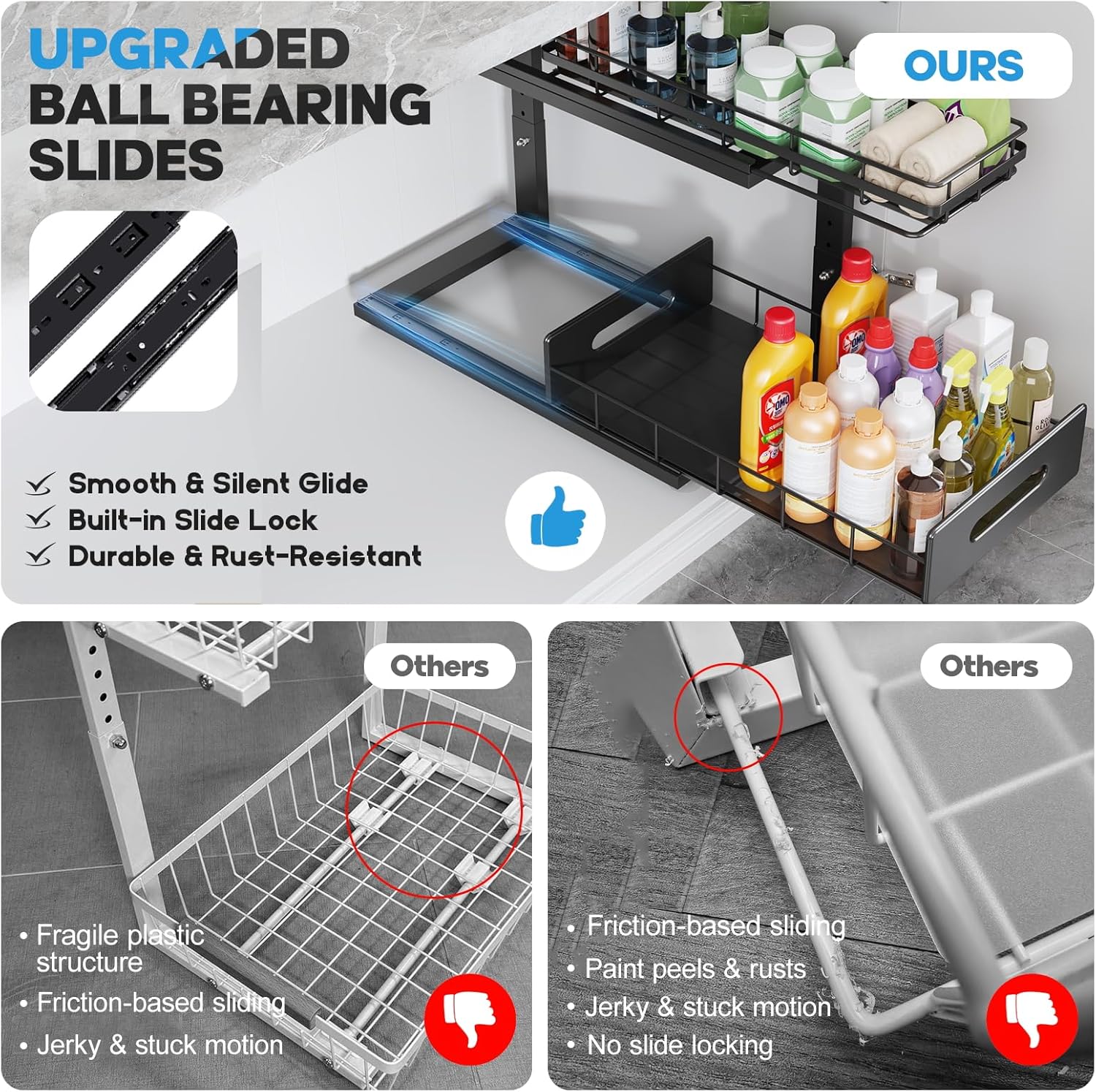 - 【Maximize Your Space】Dual-tier pull-out design offers ample storage for cleaning supplies, toiletries, and kitchen essentials—also perfect for organizing items on countertops.