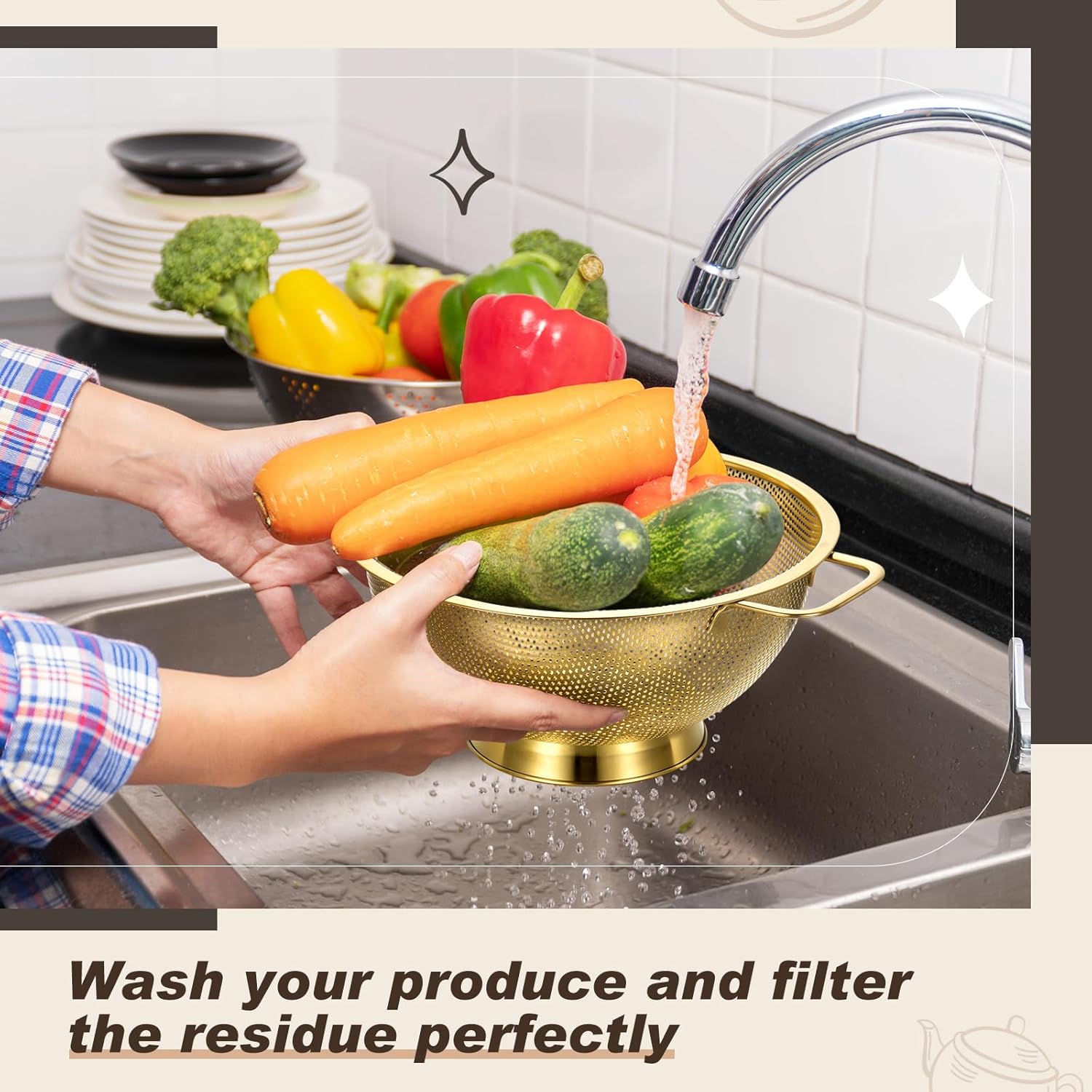 Norme 3 Quart Stainless Steel Gold Colander Gold Fine Mesh Strainer, Stainless Steel Pasta Rice Food Metal Strainer with Handles, Easy Clean and Dishwasher Safe