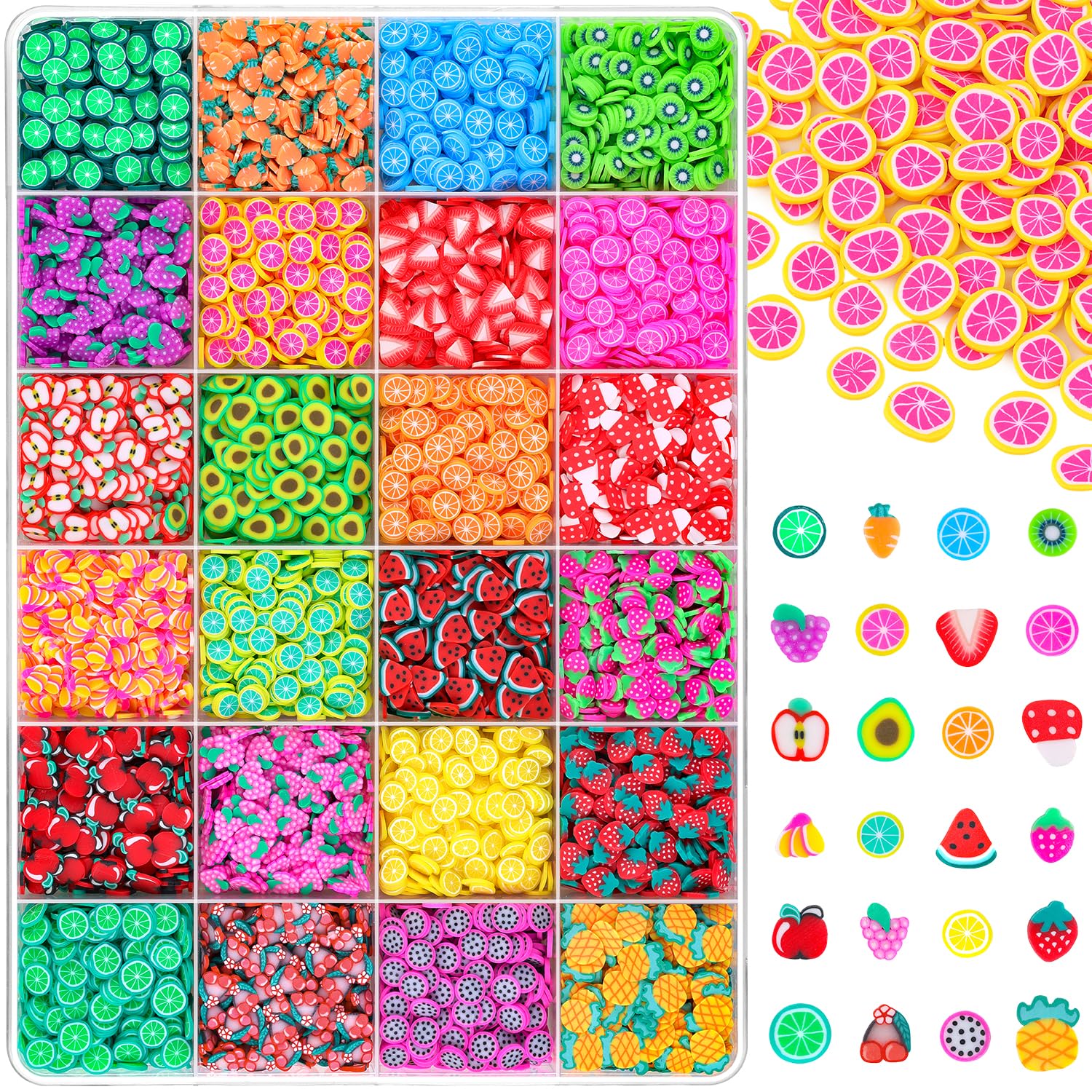 - Variety of Designs--This kit includes 24 unique fruit slice designs, like strawberries, lemon, watermelons,etc. Each piece is crafted to add a delightful touch to your slime projects, ensuring that your creations stand out and reflect your personal style