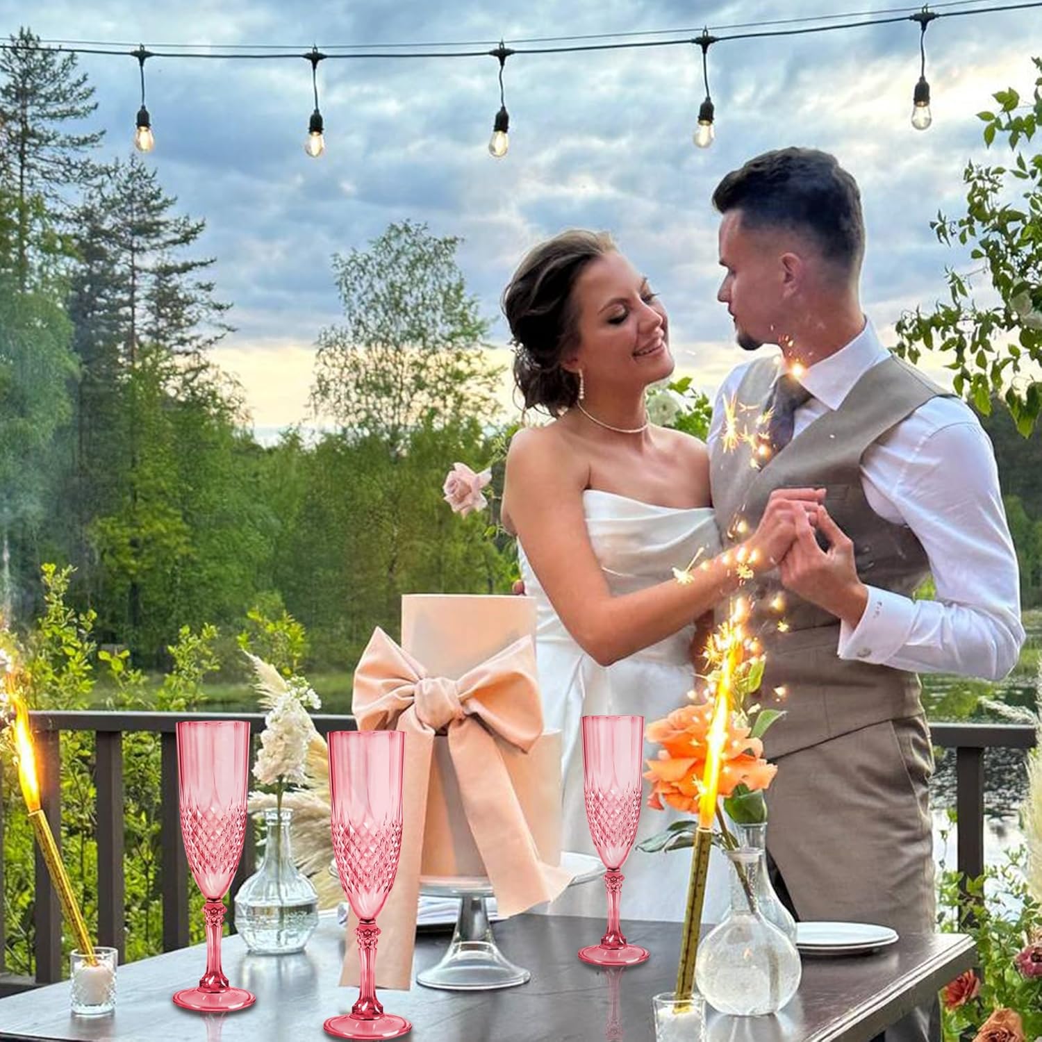 - Charming Set: Champagne flutes set include 24 retro-style light red champagne plastic wine glasses, providing ample quantity to meet your daily use and replacement needs. A suitable champagne cup is the icing on the cake. Plastic wine glasses not only carry the wine, but also carries the laughter and blessings