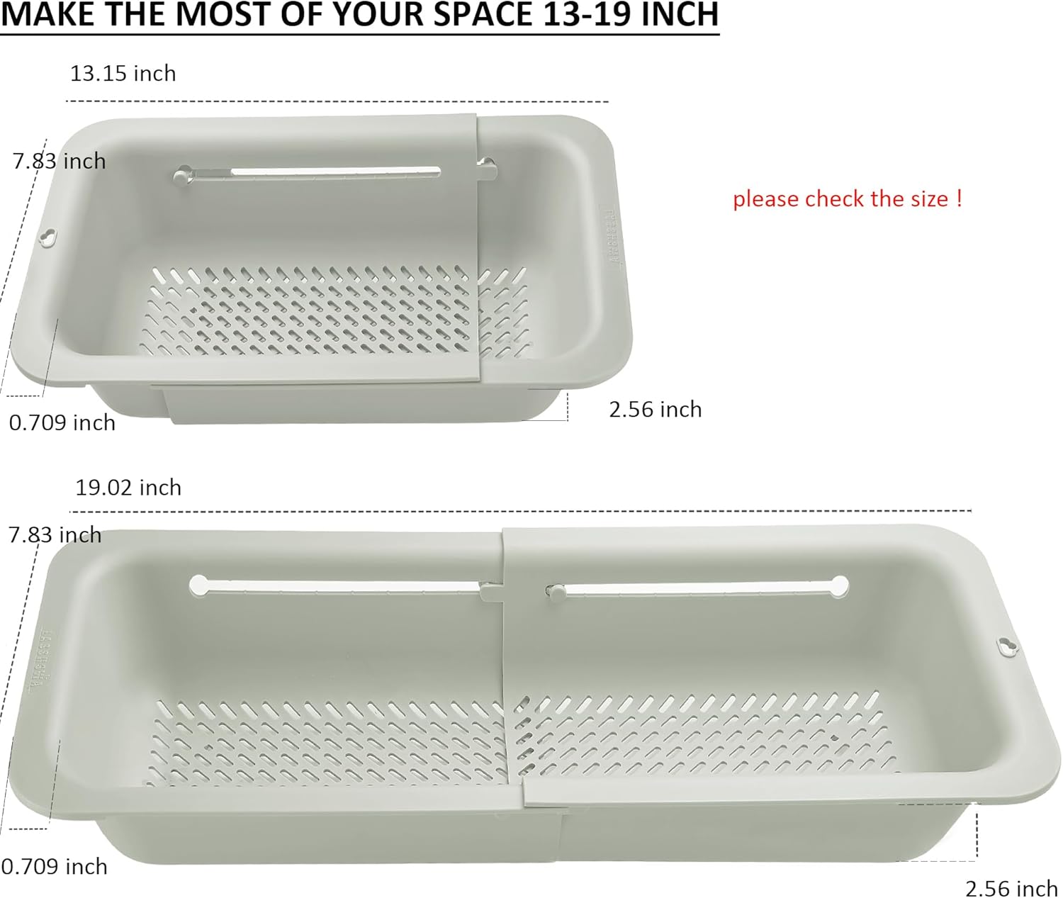 - LASSHSWA Over the sink extendable strainer, SIZE: 13-19 in (smaller space-saving design) . Stainless steel drain strainer, SIZE: Outer diameter: 4.5β; inner filter: 3β; depth: 1β . They fit for most kitchen sinks and drains.