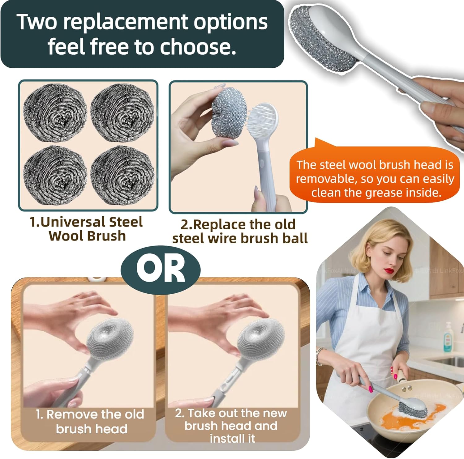 - Designed for versatility: Includes 7-inch handle ,3 specialized brush heads (steel wool scrubber brush,scrub brushes for cleaning,sponge bottle brush ) + a multi-functional storage stand. Effortlessly switch for sinks, stoves, cookware, or narrow bottles.(Provides sponge brush replacement heads,Quick purchase ASIN:B0FD9P9CZH)