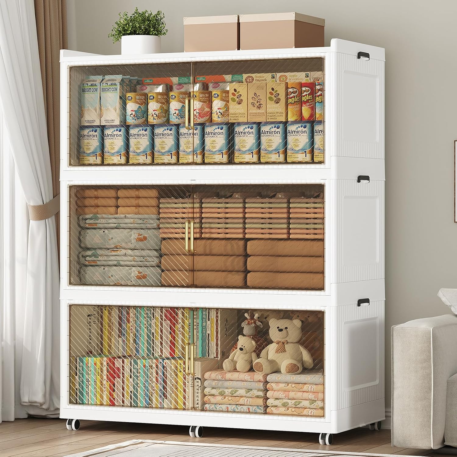 - 【Two Ways to Open & Magnetic Doors】The collapsible storage bins with lids and wheels feature a dual access way, allowing for both top and front door openings, and with clear brown windows for easy visibility. The super huge storage bins with open front doors are equipped with magnetic lock buckles to prevent dust from entering the cabinet.