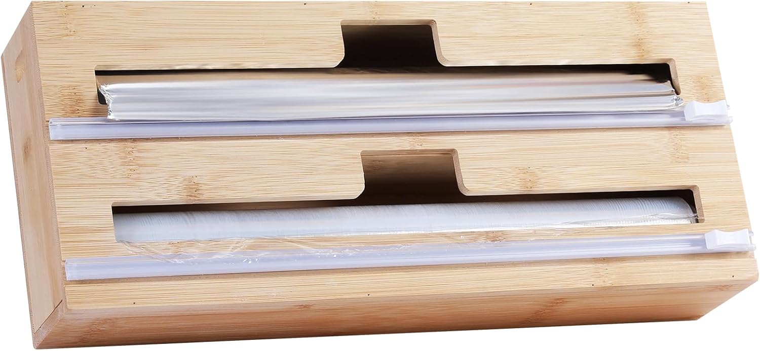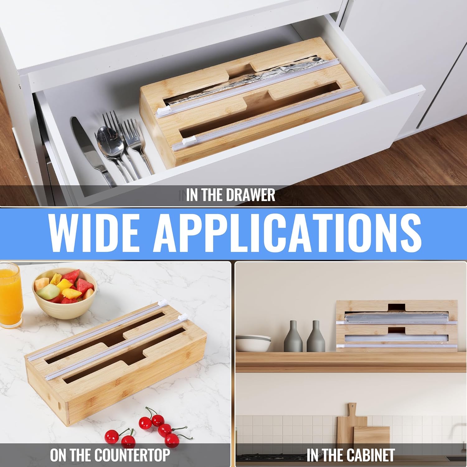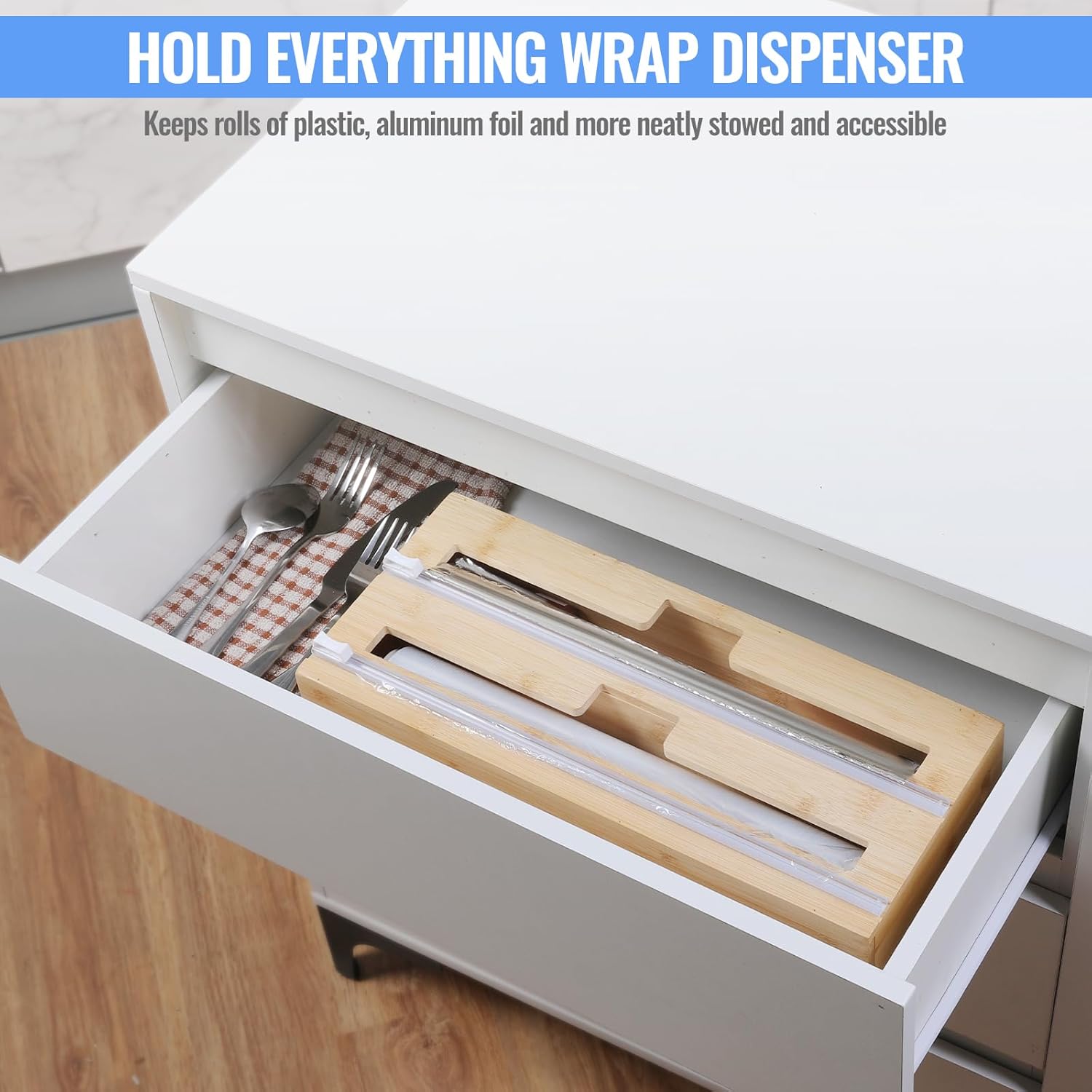 2 in 1 Plastic Wrap Dispenser with Cutter,Bamboo Foil and Plastic Wrap Organizer,Aluminum Foil and Wax Dispenser for Kitchen Drawer Storage Organization