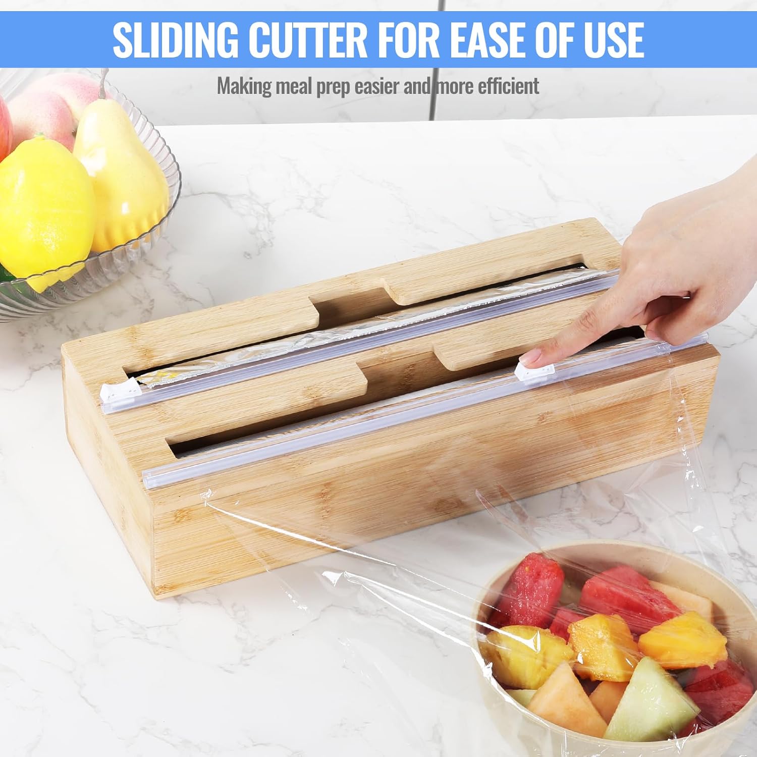 - 【BUILT-IN SLIDE CUTTER FOR CLEAN CUTS】-There's no need to use the infuriating methods of tearing by hand or cutting with scissors anymore,this dispenser with sliding cutter for slots, it ensures a clean cut everytime!Making a straight cut to the size you need, reducing cling film waste.