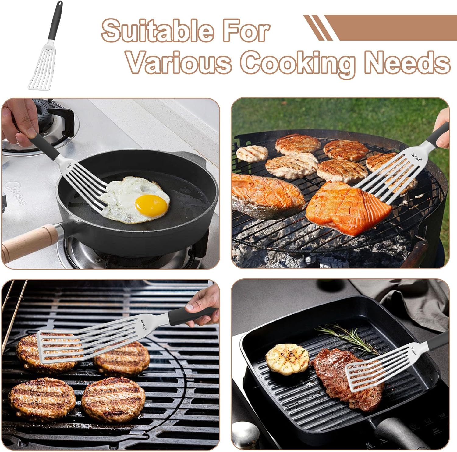 - Multipurpose Spatula Flipper: High end stainless steel fish spatula is designed for handling delicate foods, easily handling fish, eggs, pancakes and burgers. Universal metal spatula for cast iron skillet and any grills to meet all your cooking needs