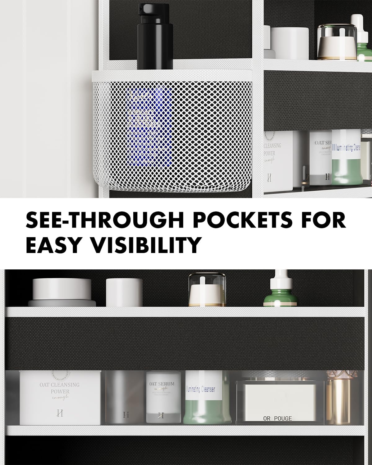 - Extra Large Capacity: Our Behind the Door Organizer measures 55βx 15βx 7β, providing plenty of space for organization and storage. This sturdy over the door organizer can hold up to 50 lbs and has 6 spacious front pockets designed 4 different sizes of flexible storage for different storage needs. The 12 mesh side pockets are perfect for lipstick, keys, chargers, remotes, glasses and other small household essentials.